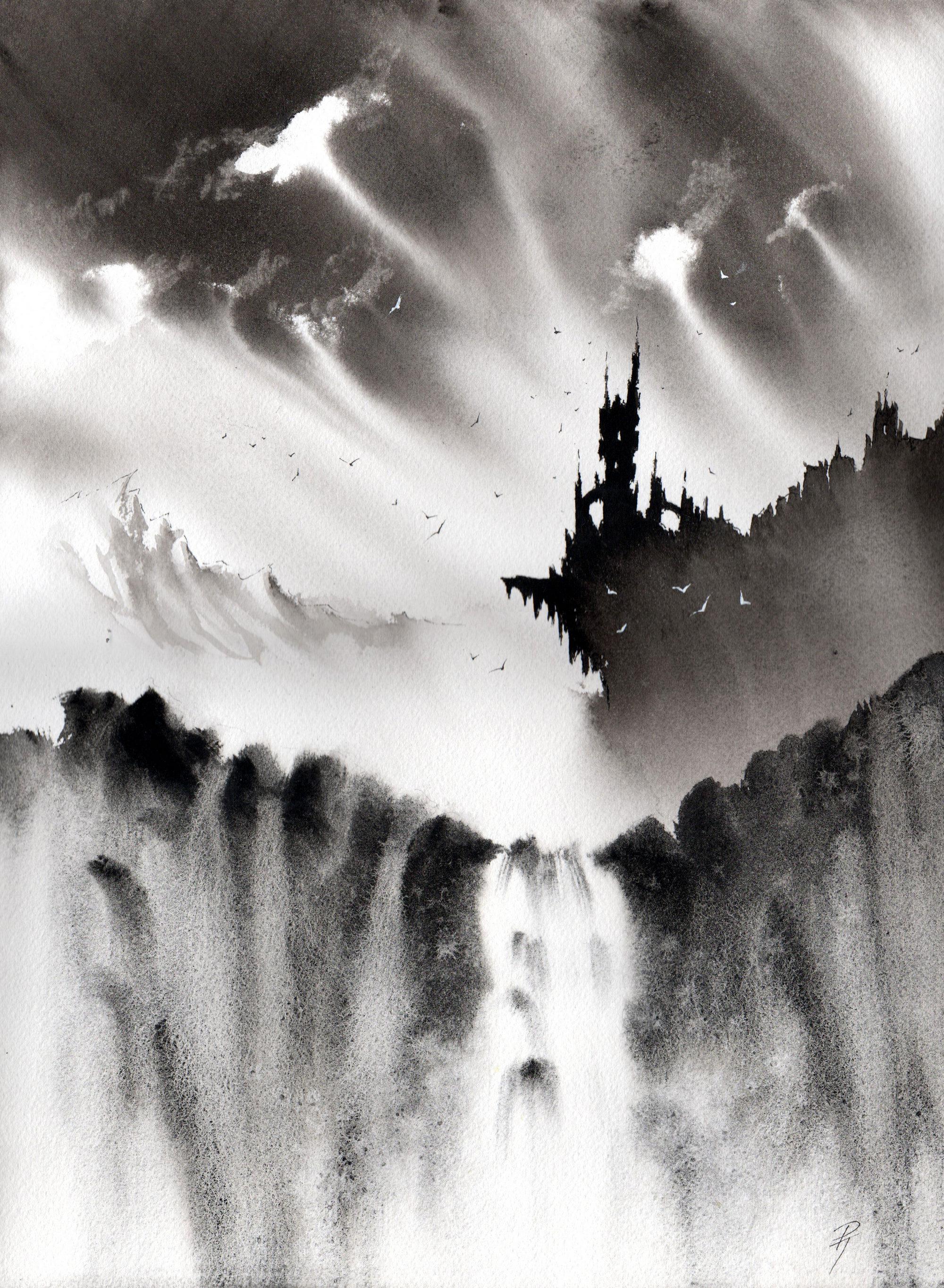 Oh, I love this. There is a real otherworldly feel to it. I mean is that meant to be a tower and waterfall with light breaking through clouds - or an attack coming from above? It can be interpreted any number of ways.