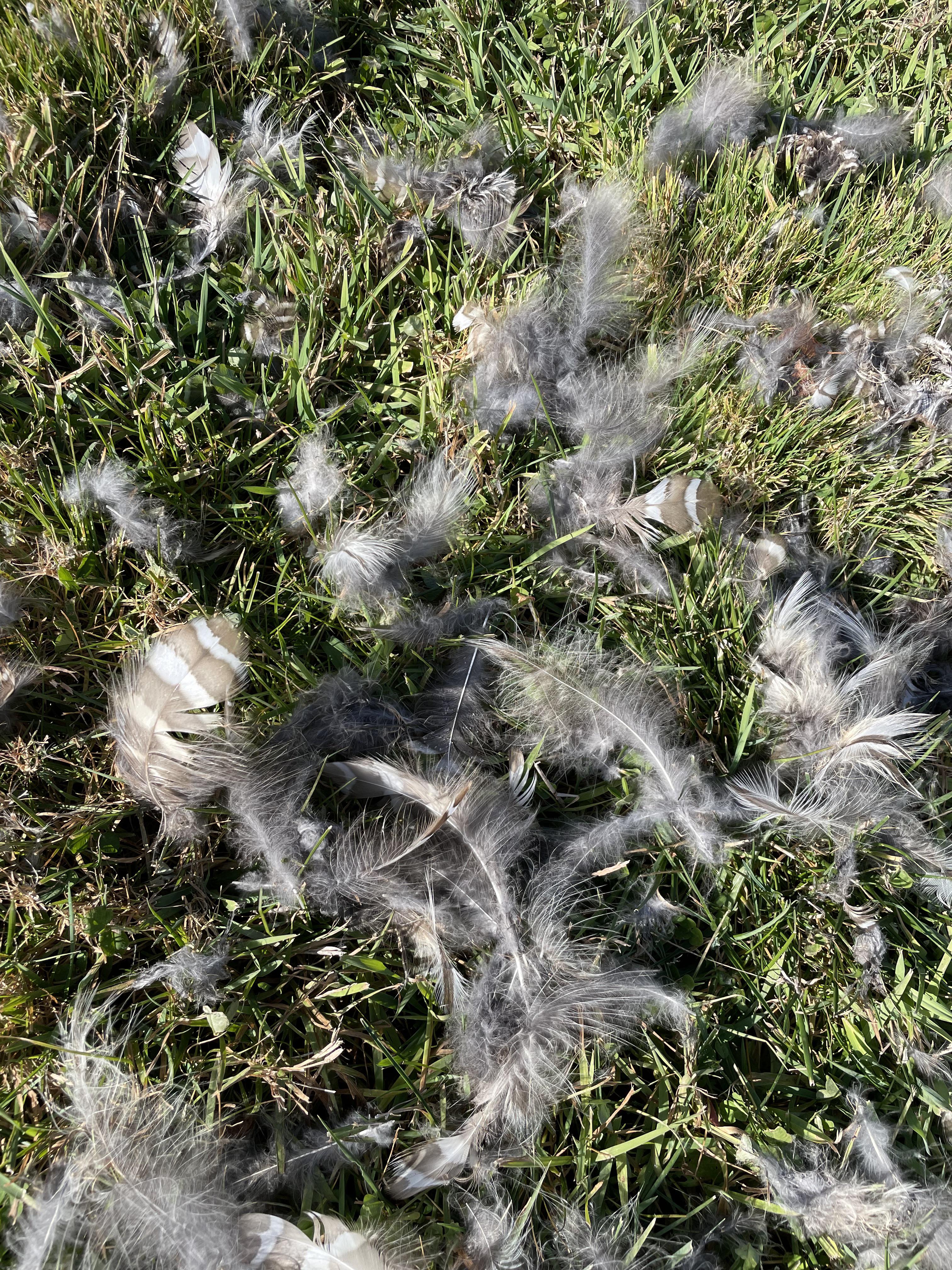 Striped feathers are probably from the hawk that killed it.