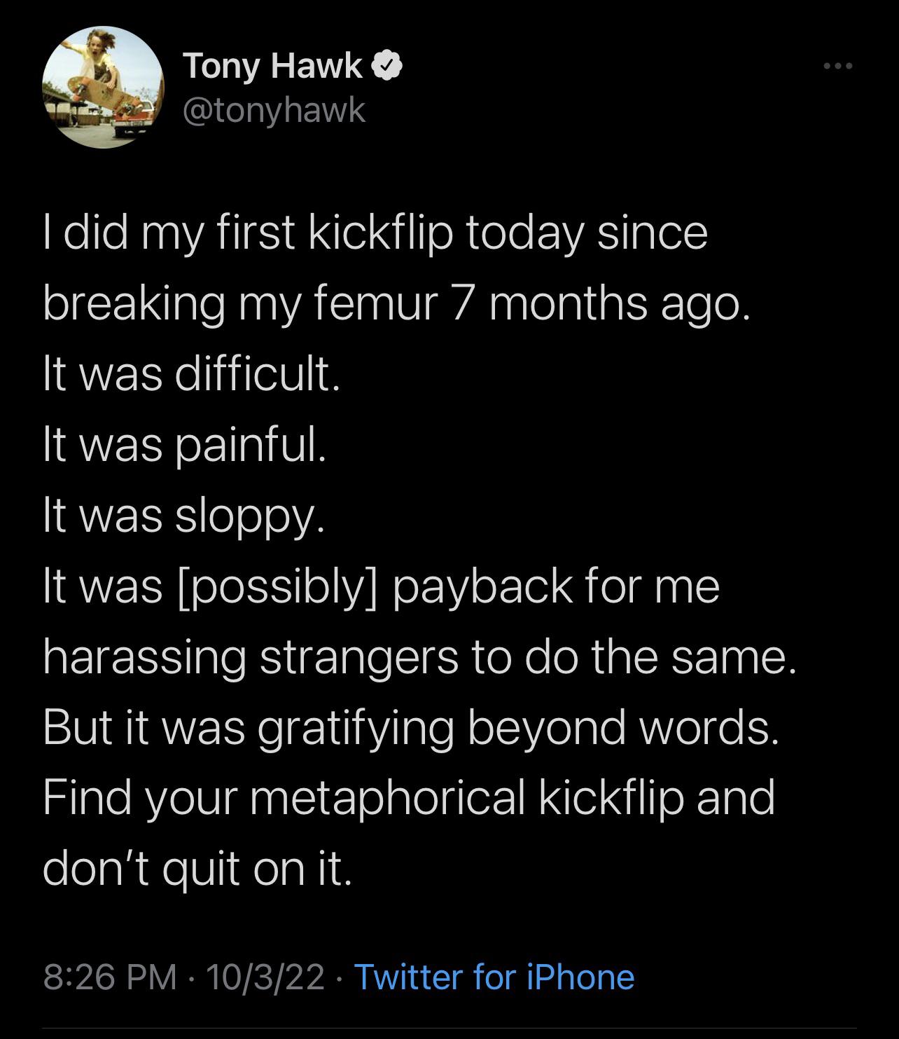 Reply to comment by [deleted] in [Image] Tony Hawk’s Tweets About First Kickflip Post Injury by banaaanaaaaaa