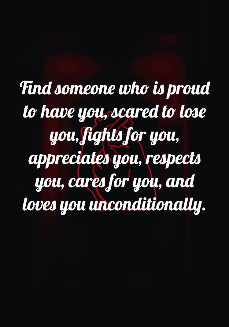 [Image] Find someone who is proud to have you, scared to lose you, fights for you, appreciates you, respects you, cares for you, and loves you unconditionally. Submitted by Omega_Neelay t3_zfturi on December 8, 2022 at 9:03 AM in GetMotivated 20 comments 56