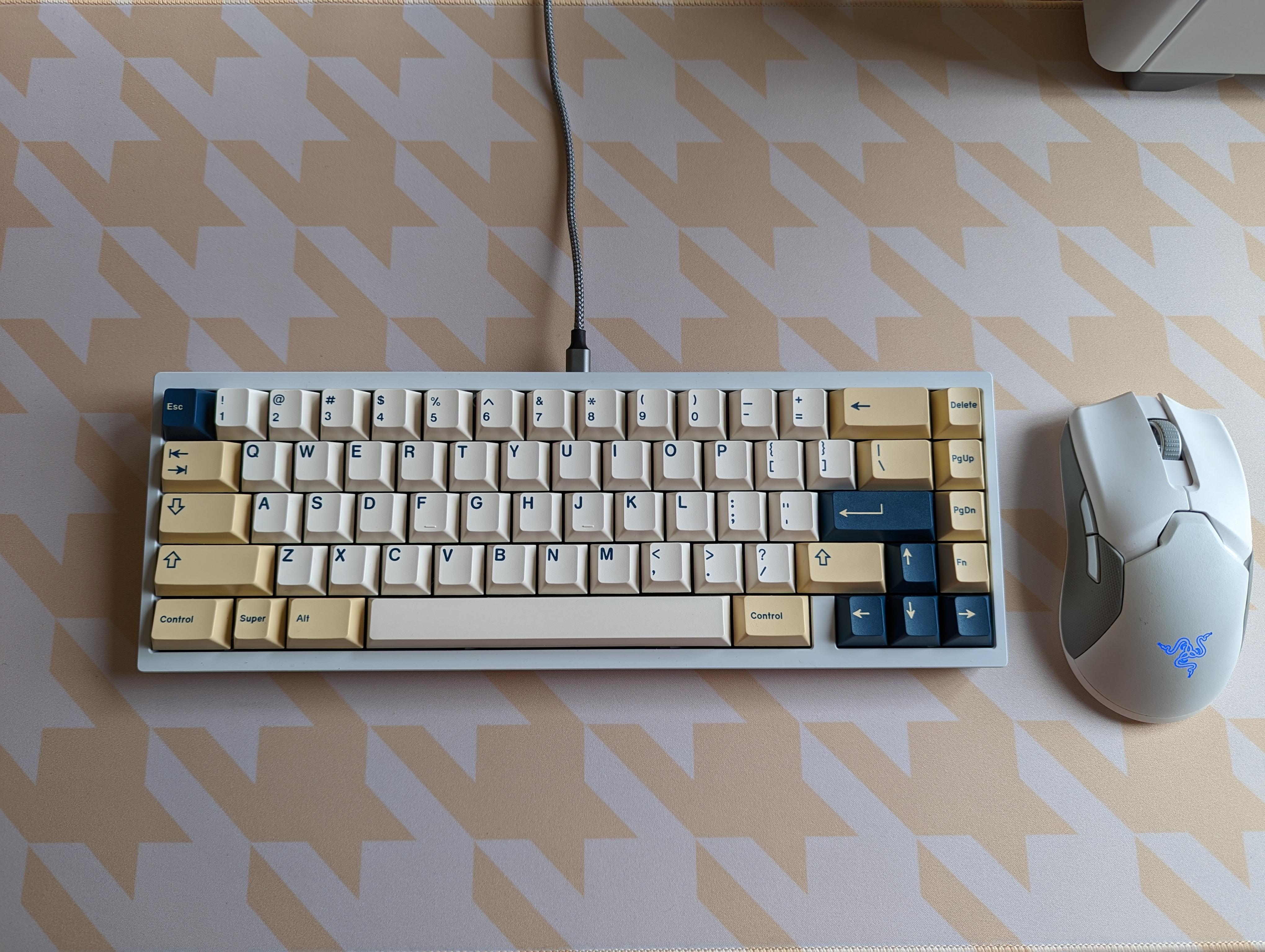 Nice looking setup. Love the houndstooth deskmat to match Birch and the white case.