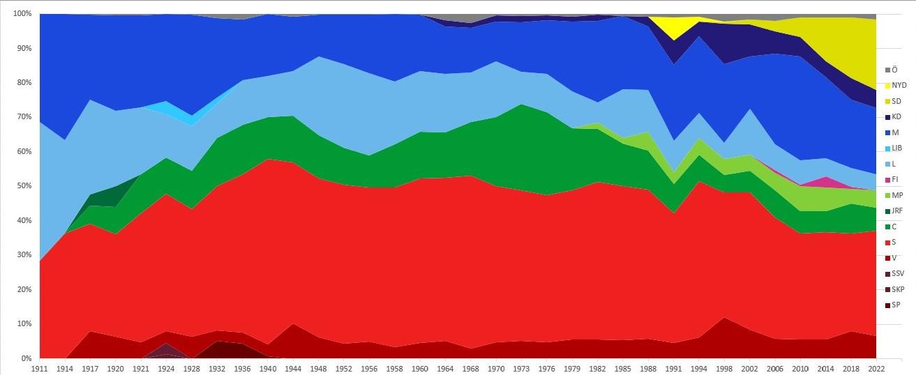 [OC] The representation of the Swedish parties in the Swedish parliament over time since 1911. Submitted by MaxEin t3_y5ej3q on October 16, 2022 at 11:27 AM in dataisbeautiful 19 comments 65