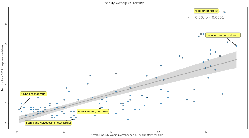 Right? I doubt the Pew data for the worship numbers is even accurate, too, but even if we take it as if it is, 0.6 isn’t convincing.