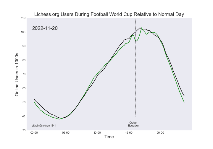 I got some great feedback from my previous post and so updated the visual to make it easier to interpret. The black line is a standard day and green is each day of the world cup so far. Full code is here https://github.com/michael1241/wclichess including the data used to generate it.