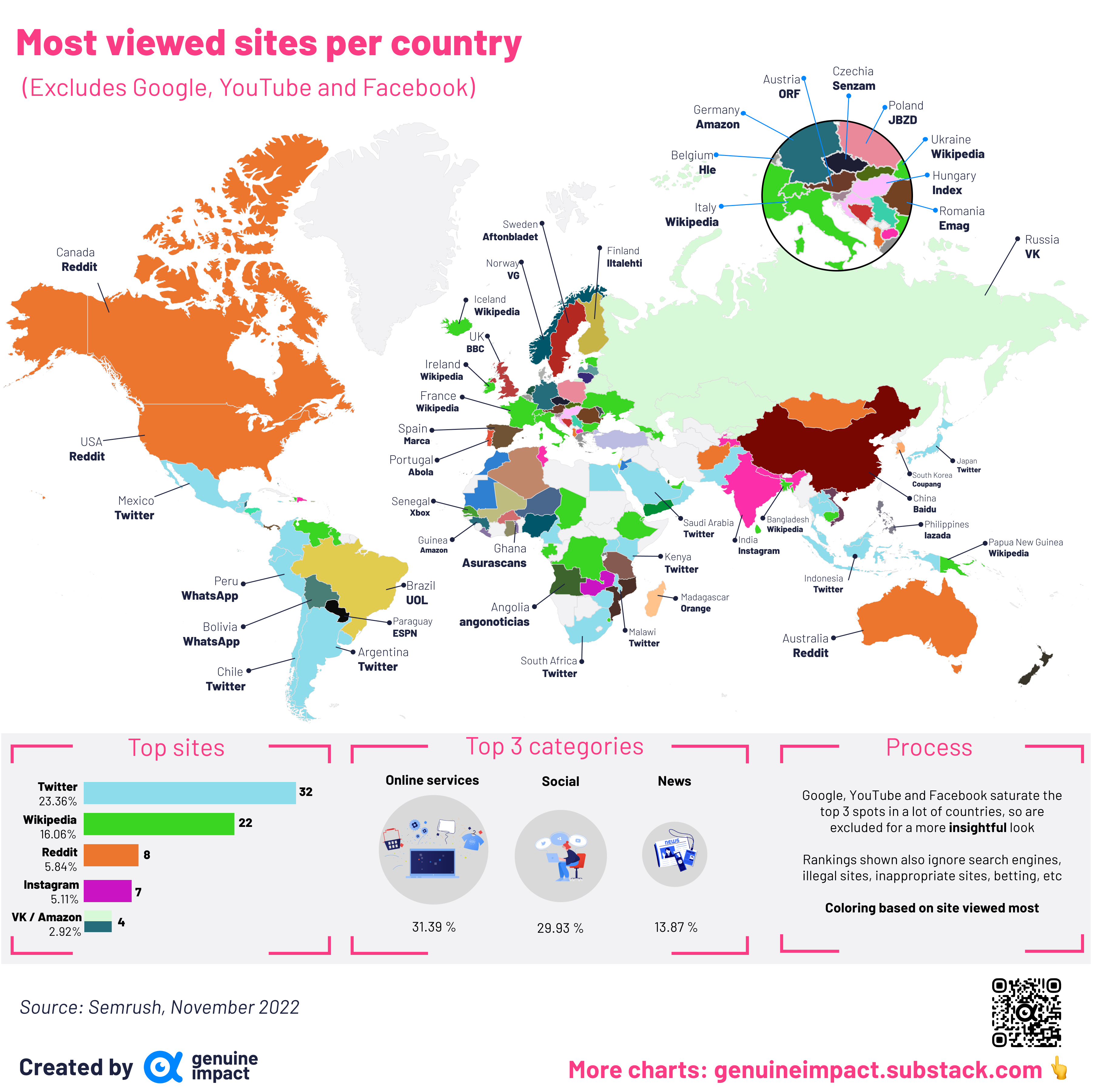[OC] The most popular websites in every country (excluding Google, YT, FB, other search engines and other inappropriate sites for a more insightful map) Submitted by giteam t3_1030g3i on January 4, 2023 at 10:40 AM in dataisbeautiful 159 comments 408
