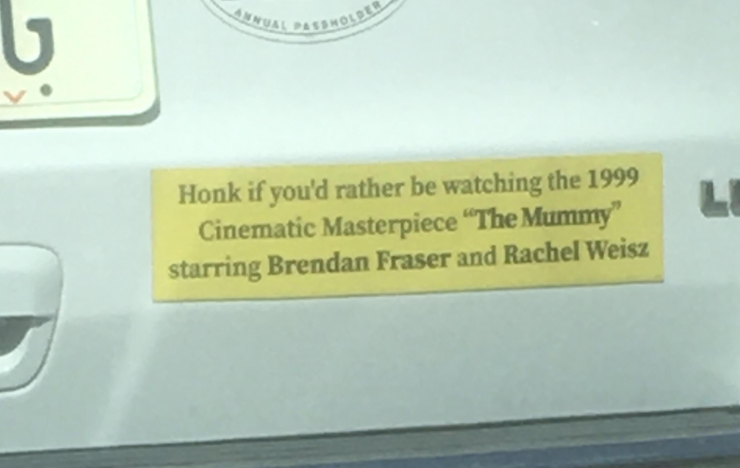 I've seen this sticker on Reddit multiple times, but only once in person. I really wanted to honk, but I live in a state where everybody's packing and while The Mummy IS a cinematic masterpiece, it's not worth dying for.