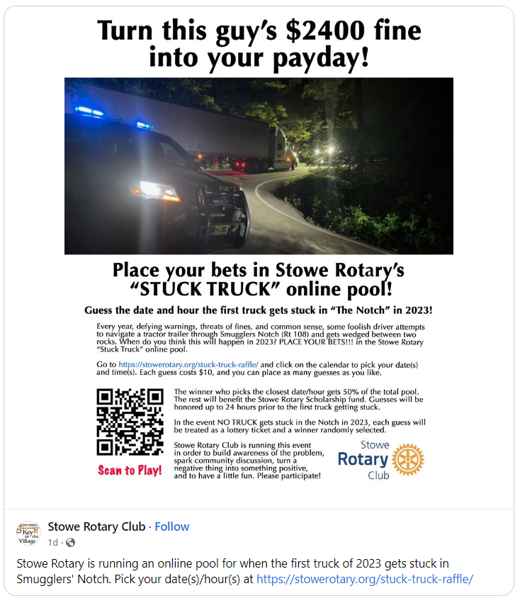 >"The winner who picks the closest date/hour gets 50% of the total pool. The rest will benefit the Stowe Rotary Scholarship Fund."