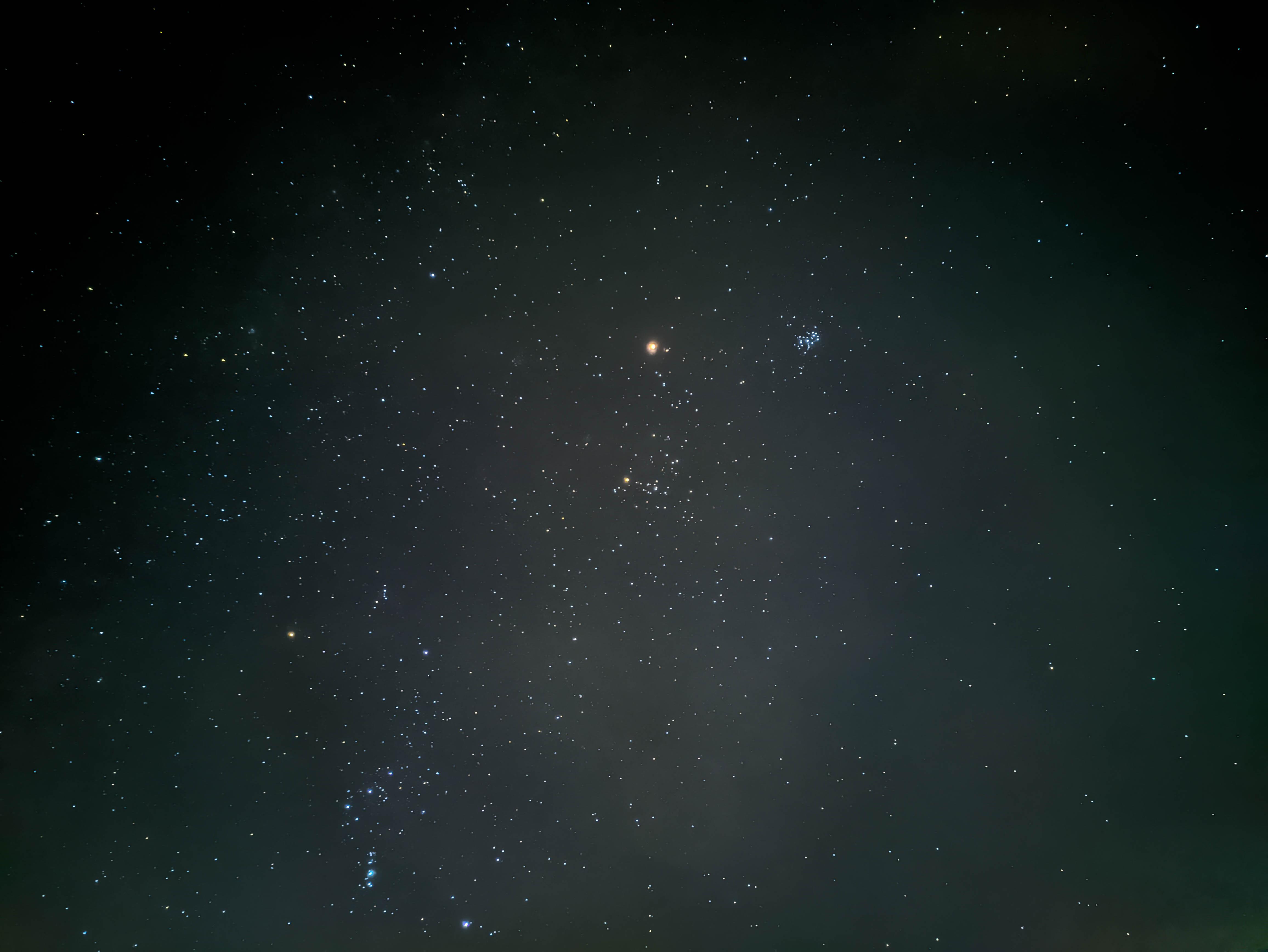 In the middle the biggest orange dot is the Mars next to it on the right side that many blue dot is the Pleiades. Under the Mars is the Hyades star cluster and on the left bottom of the picture you can see the Orion Nebula.