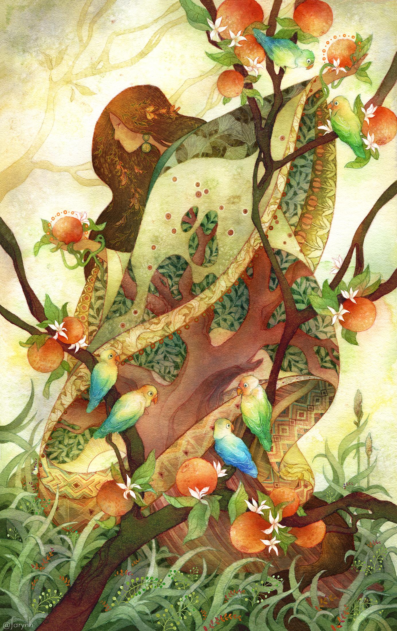 Thank you! I do the painting in watercolor and fountain pen ink, then the little details like the delicate plants in the grass, detail in her hair, patterns on the hem of her robe, etc, are added in procreate. There's also a little color correction I do with the scan.