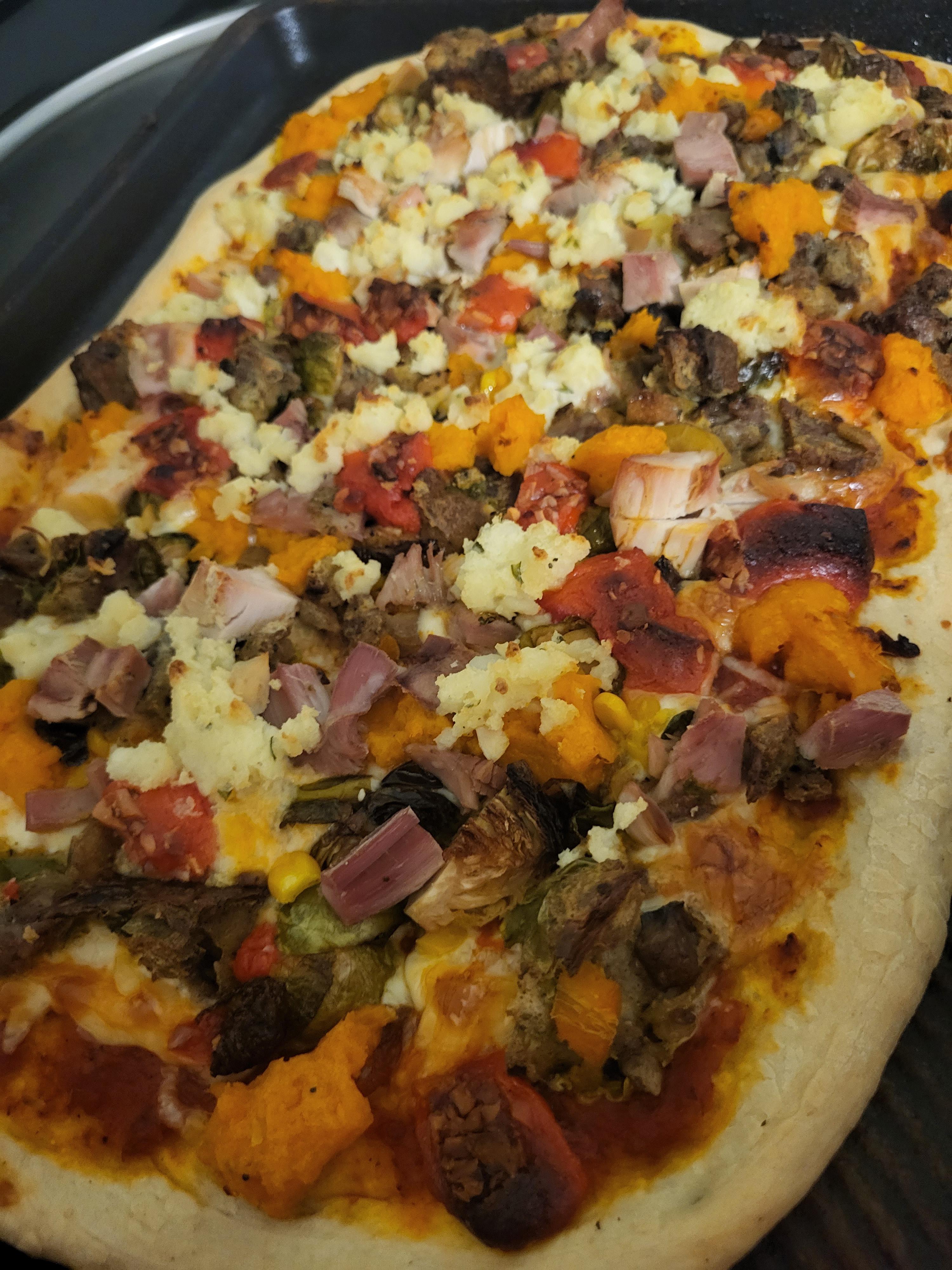 My favorite Thanksgiving tradition. I use my leftovers every year to make a pizza. This year it has turkey, homemade Stuffing, sweet potatoes, Brussel sprouts, mashed potatoes, Port wine cheese and corn.