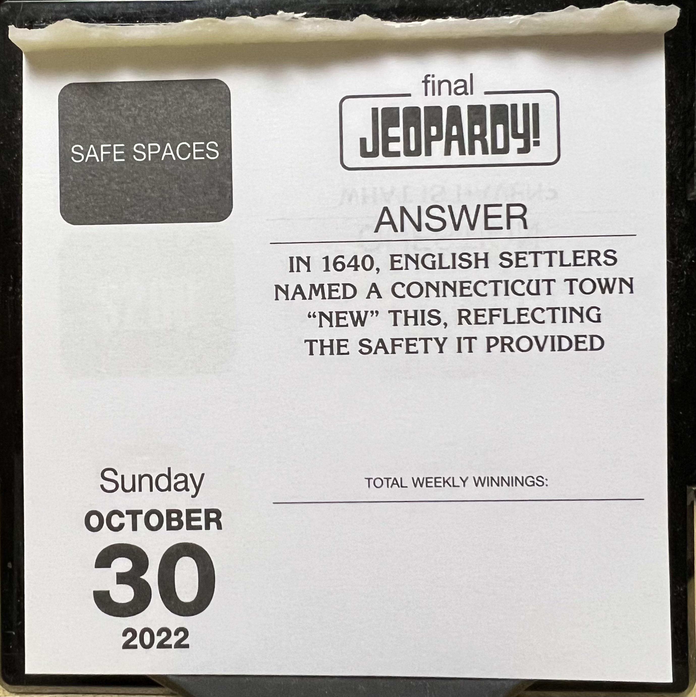 Today’s Jeopardy! Clue…it’s New Canaan, right? It’s gotta be New Canaan :) Submitted by SteveAndyW t3_yhanlb on October 30, 2022 at 10:06 AM in newhaven 29 comments 55