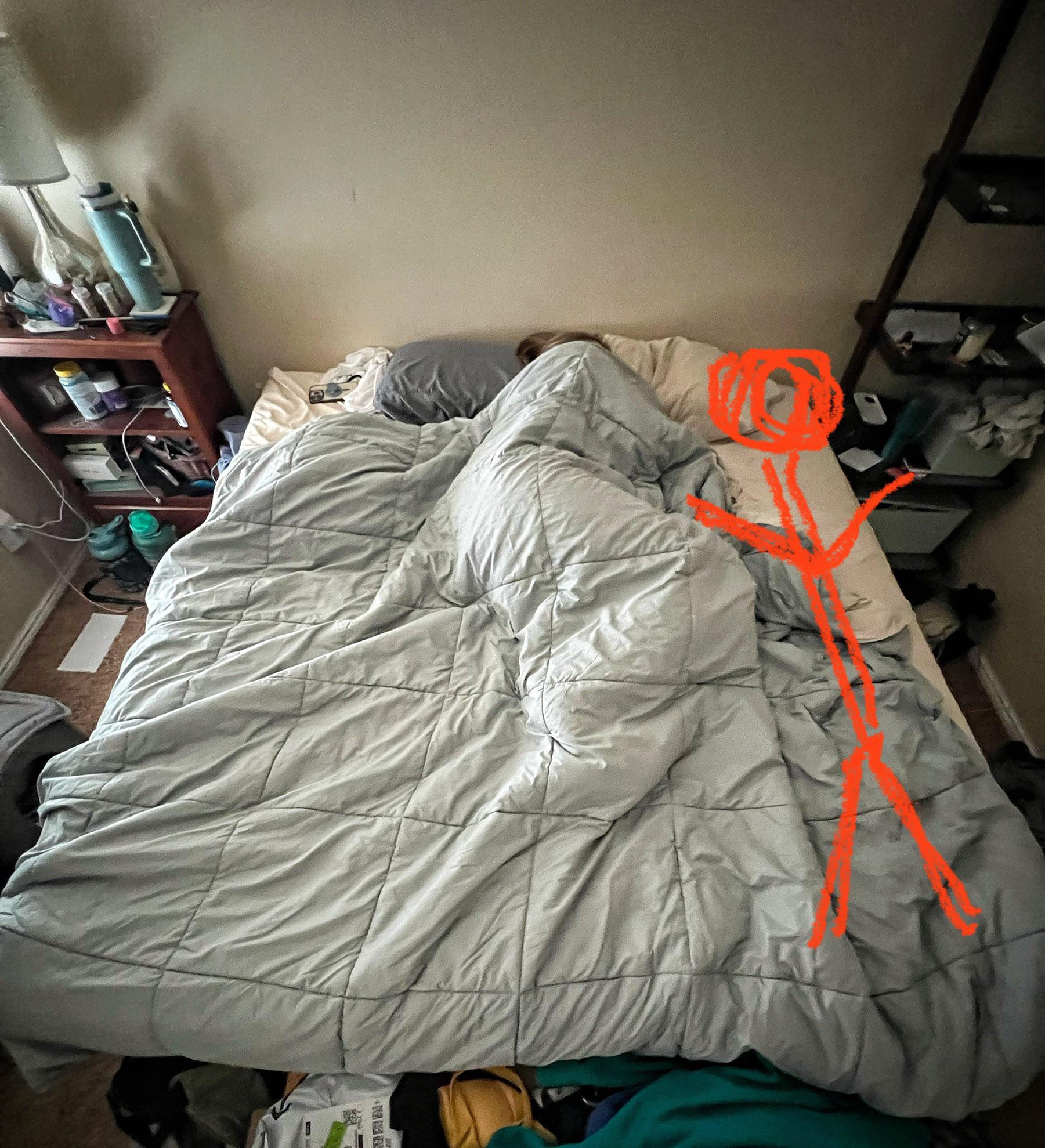 Artist rendering of how much space my wife leaves me in bed. Approx 5000 square inches of a possible 6080. Shes the Ghengis Khan of the king mattress Submitted by Therealfern1 t3_11oosnr on March 11, 2023 at 4:48 PM in funny No comments 2