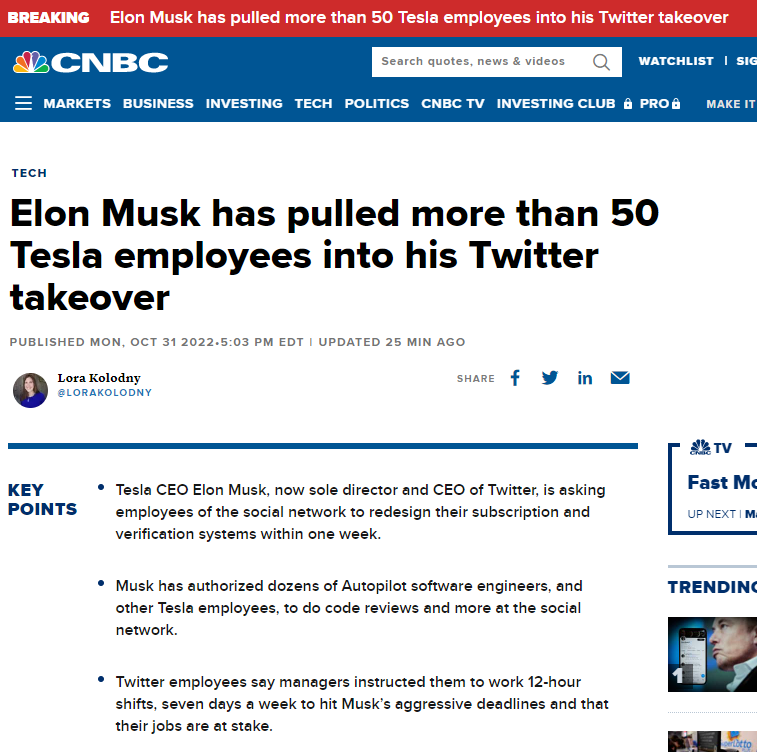 Tesla's autopilot software engineers are working for Twitter now Submitted by katefromnyc t3_yipnvx on October 31, 2022 at 9:35 PM in wallstreetbets No comments 5