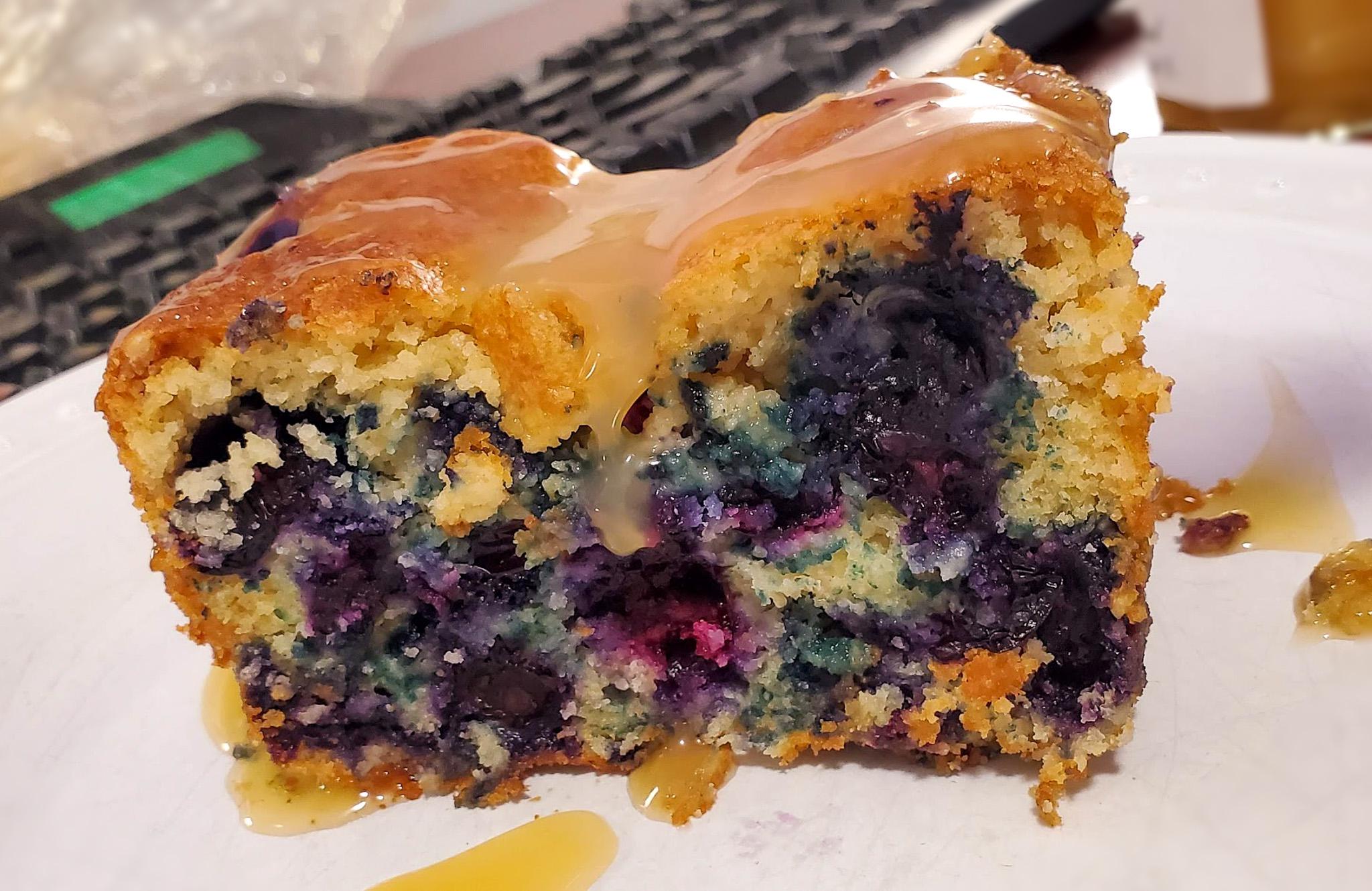 I just basically looked up a blueberry loaf recipe online and made a few modifications, adding less sugar, more baking powder and a lot more berries. I had some Lemon Curd in the fridge and thought this would go well on top. My next piece I tossed it in some egg and turned it in to a French toast with the curd on it. Sometimes I don't make the best choices when drunk lol.