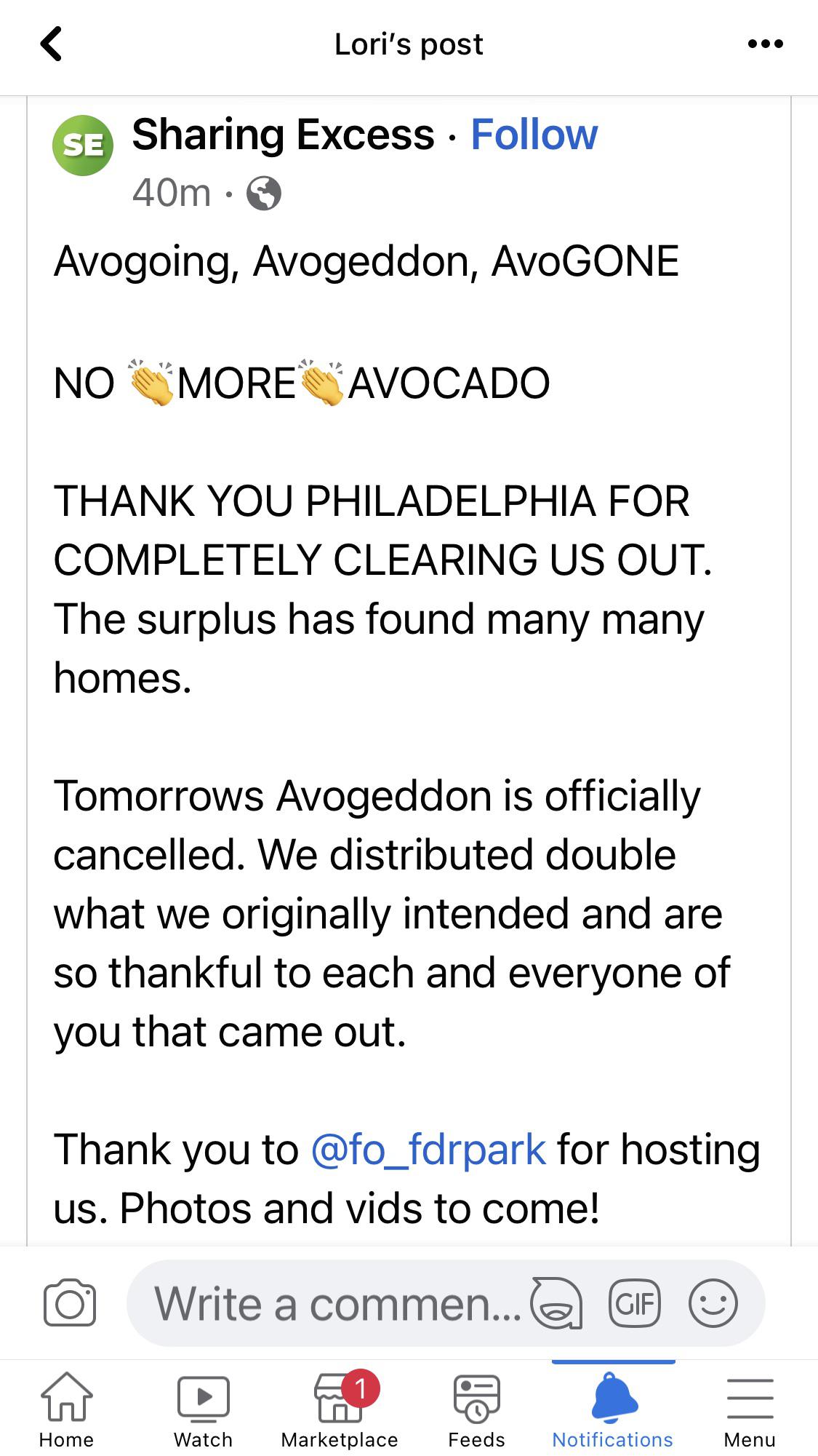 FDR park just posted that the organizers giving away avocados have run out of them and won’t be giving any more away. Sorry. I got a case gifted to me from a friend and they look perfect