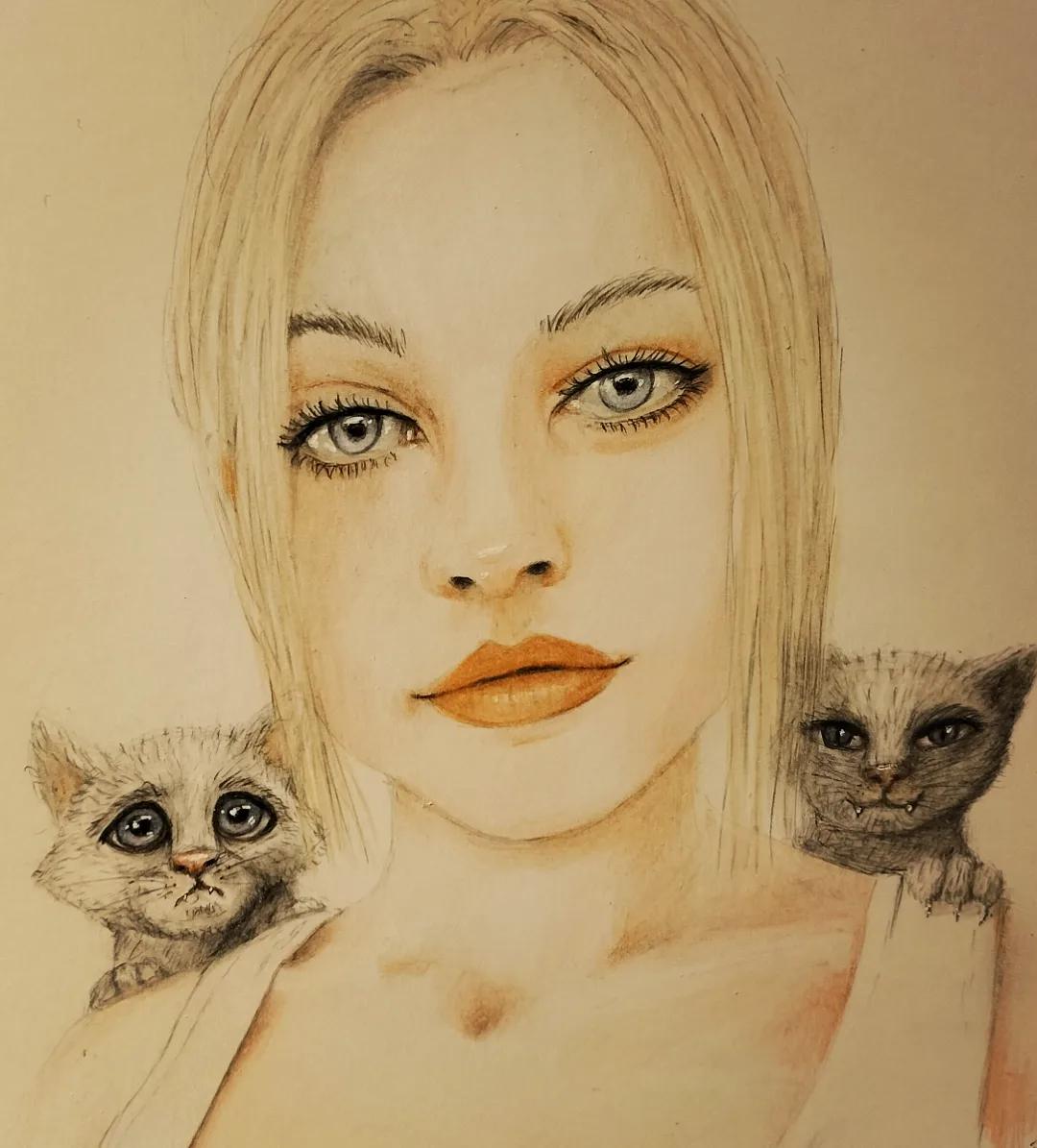 I'm sorry but it's not me on the Portrait. I Drew it. I'm a Guy and I don't have cats. 😅