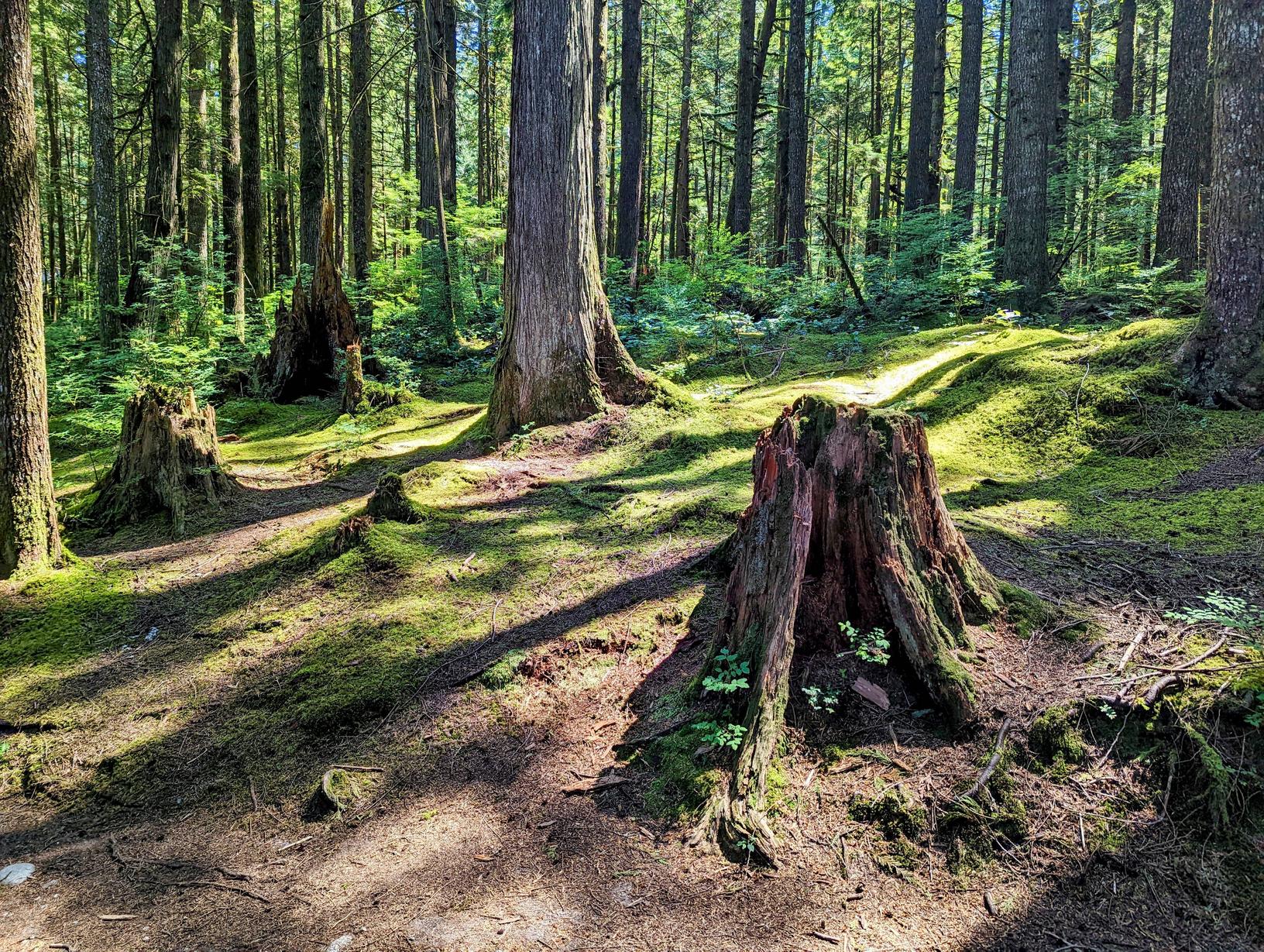 Not old growth. Those stumps may have been the original harvest. Old growth doesn’t have stumps as it hasn’t been harvested yet.