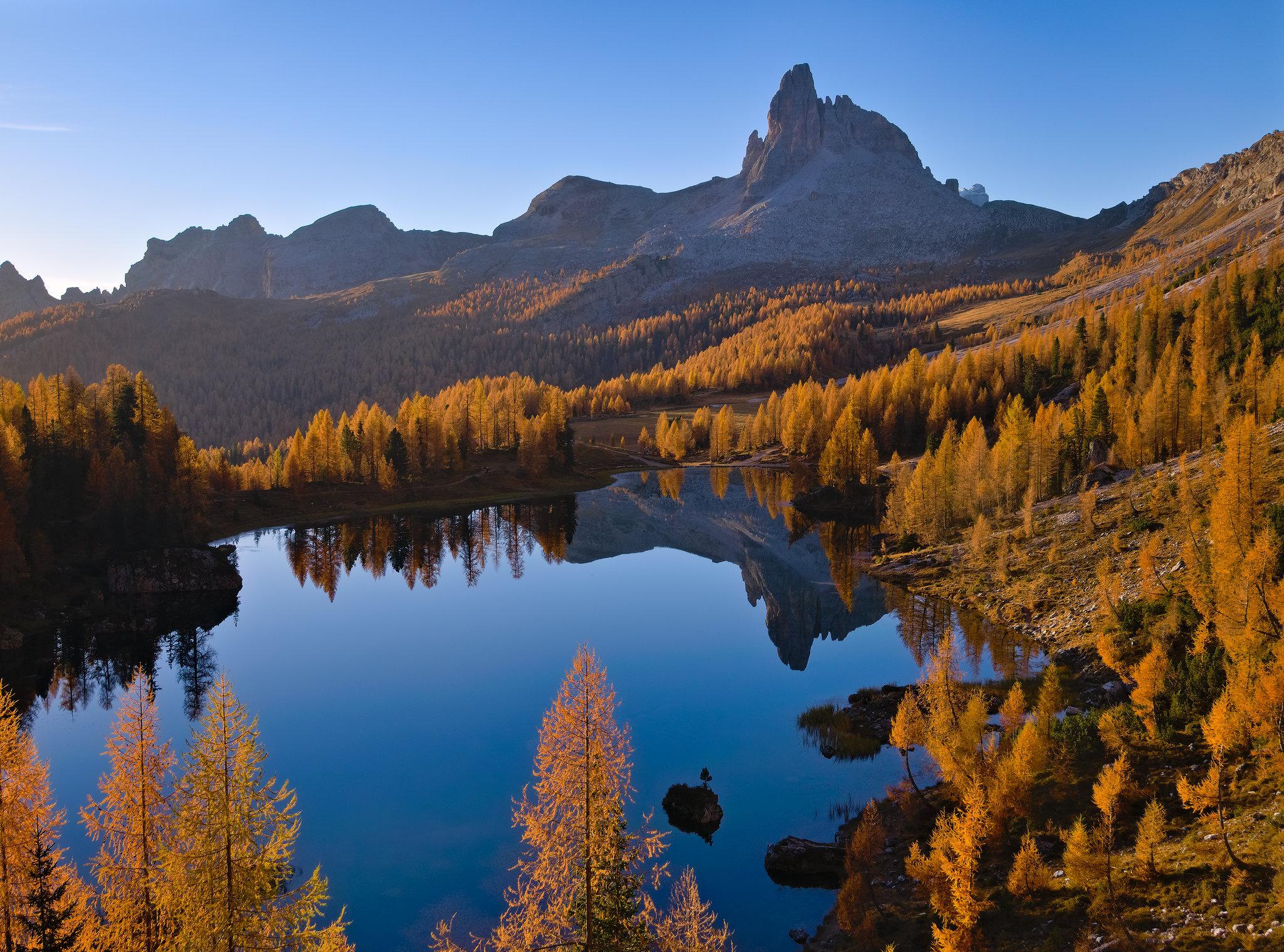 Something I discovered while roaming around the Italian Dolomites this fall was that larches shine best when lit from behind. Unlike other fall trees which look equally good with front light, larches have thin needles which glow in their entirety when the sun shines through them, creating a fantastic effect that feels like watching a lit torch. This high alpine lake was the perfect place to watch that magic happen as it was surrounded by a sea of the deciduous conifers that lit up fantastically with the rising sun, justifying the decision to hike up here in the predawn light.