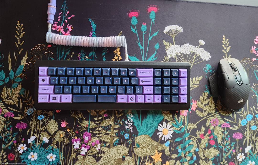 Candybar R3 Mintlodica Magic Girl Dark keycaps Durock V1 switches, l&f Alpaca Cables coiled cable Random deskmat off Amazon