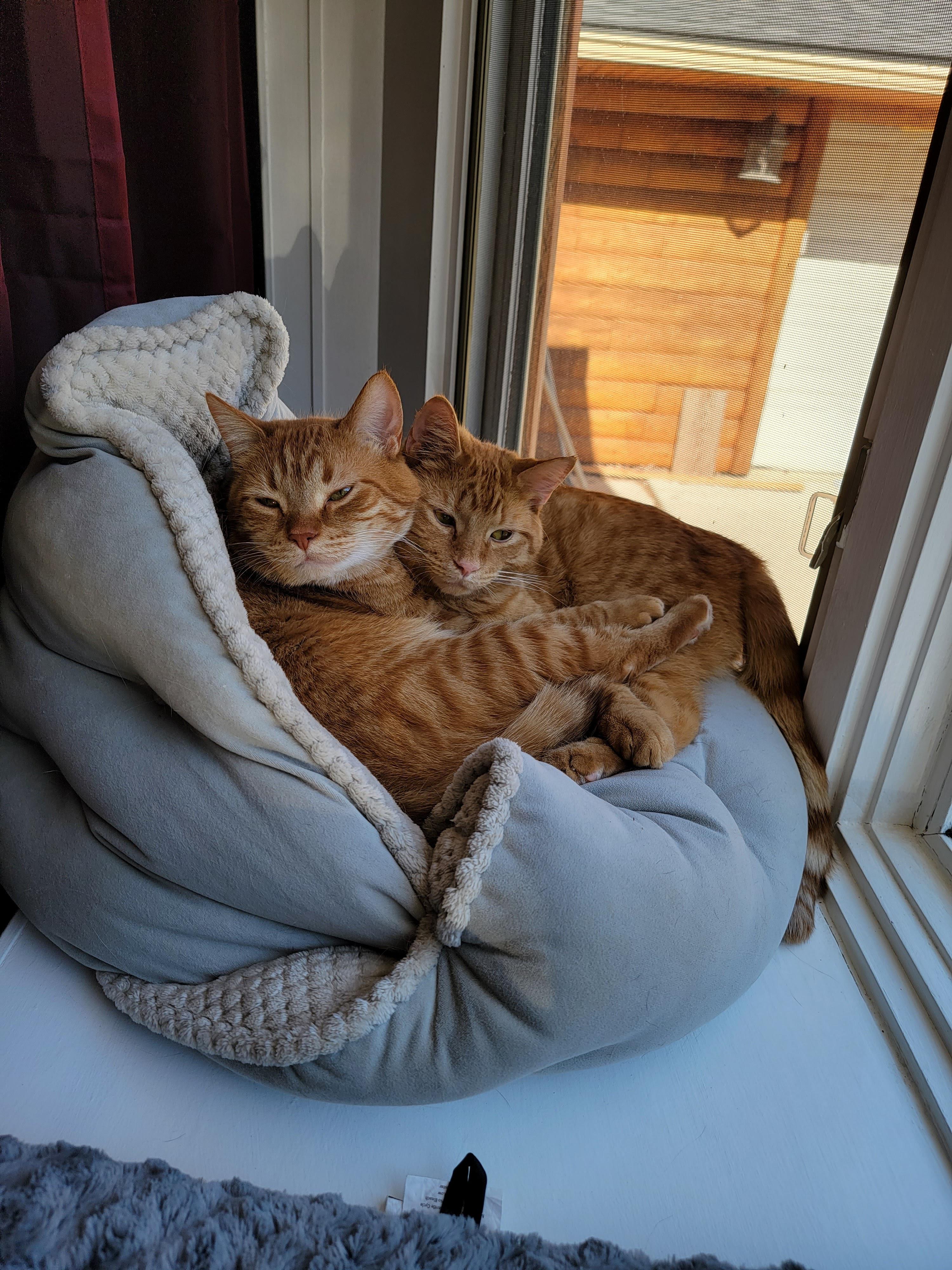 Lefty is two years older than right. He doesn't seem shelter anywhere just does what he wants. Righty came to us as a 6 week old street rescue. He cared for him since day one protecting and cleaning him all the time lmao. They're just cats being cats
