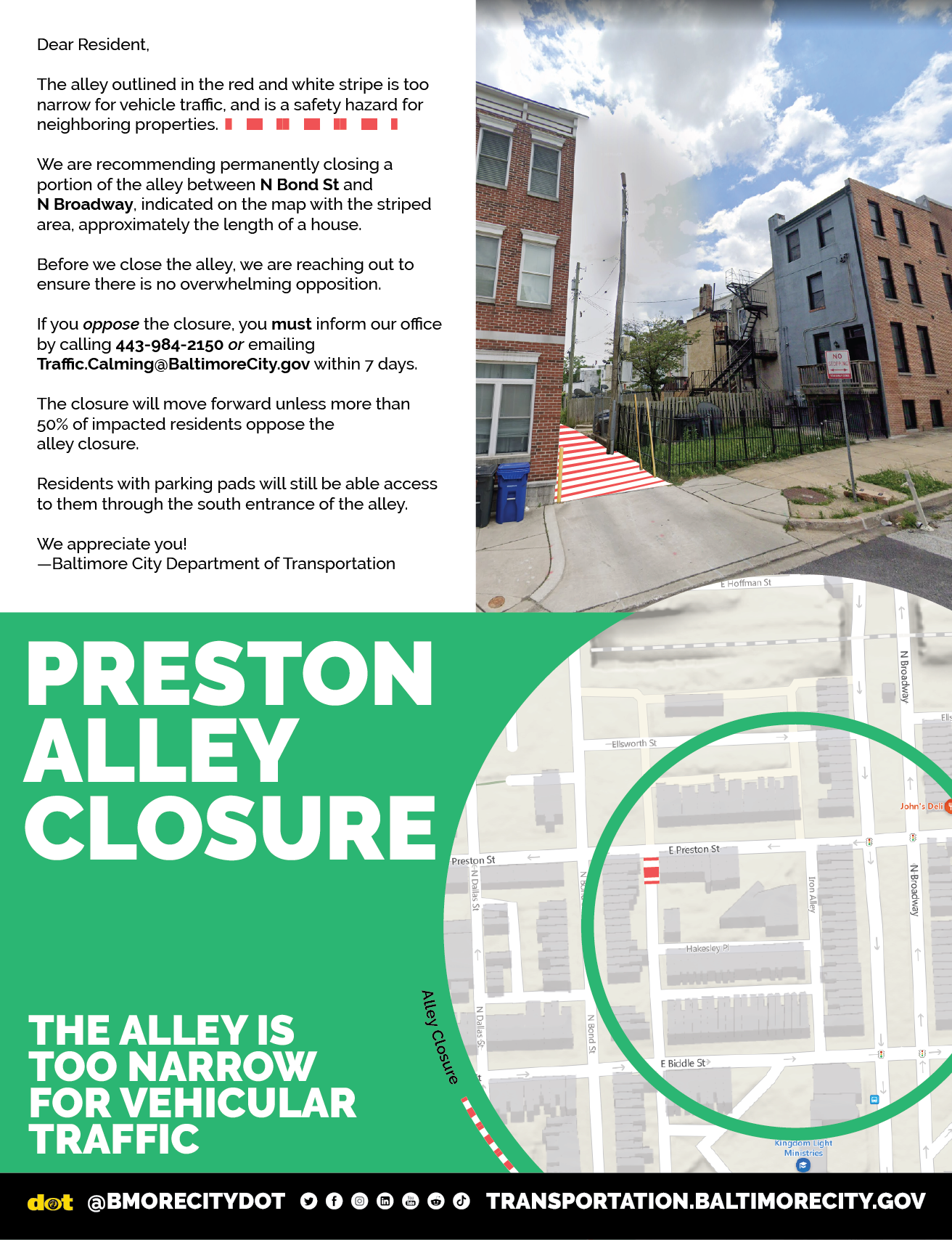 Reply to comment by BmoreCityDOT in We plan to permanently close the alley between N Bond St & N Broadway, as it is too narrow for vehicle traffic. If you oppose the closure, you must inform our office by calling 443-984-2150 or emailing Traffic.Calming@BaltimoreCity.gov within 7 days. by BmoreCityDOT