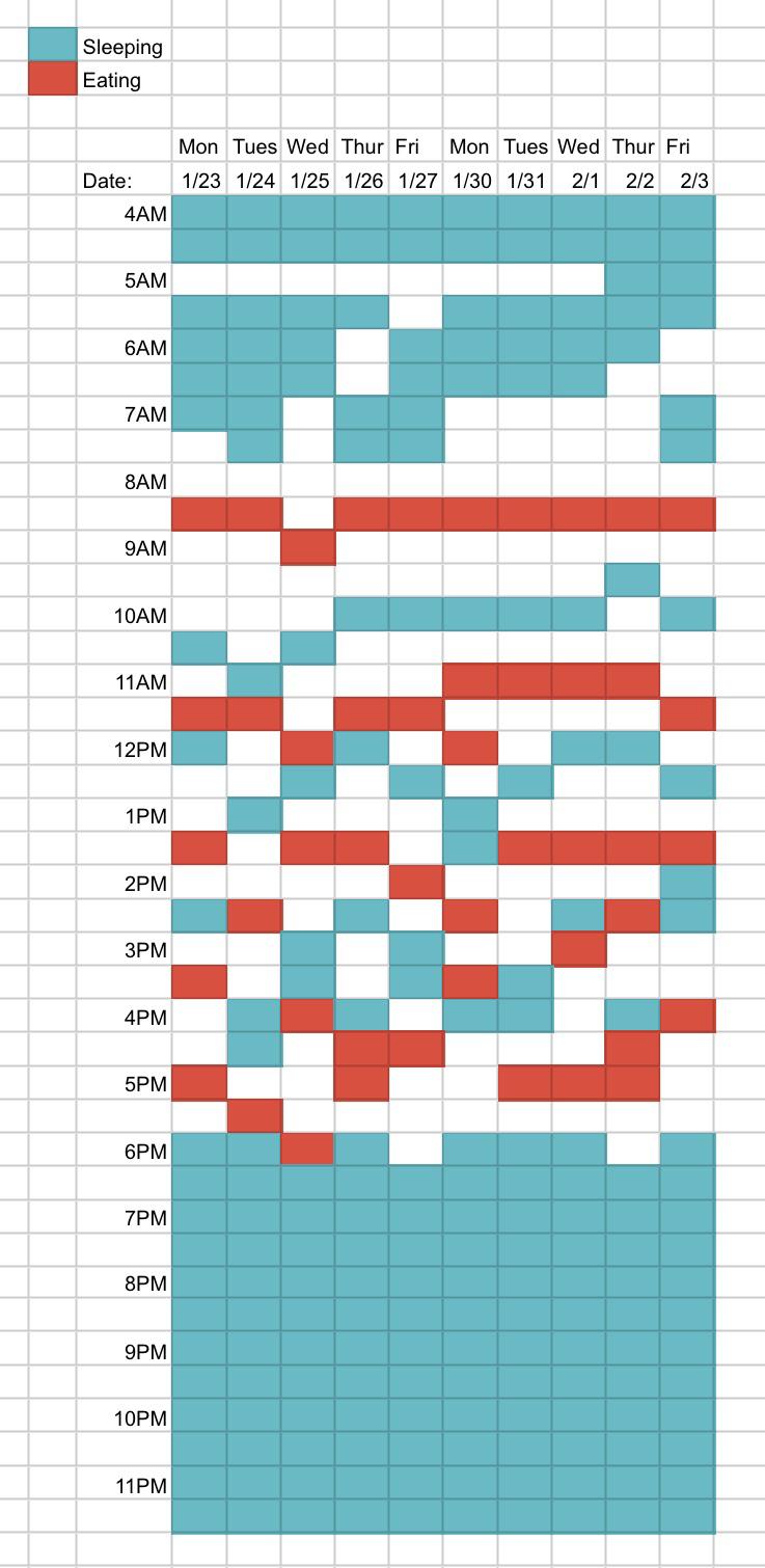 06:00-08:00 awake, feed, play 08:00-09:00 am sleep 09:00-10:30 awake, feed, play 10:30-13:00 sleep 13:00-15:00 awake, feed, play 15:00-16:00 sleep 16:00-18:00 awake, feed, play. Try to feed twice so she's full for the night 18:00-21:00 sleep 21:00-22:00 awake, feed, play 22:00-06:00 sleep