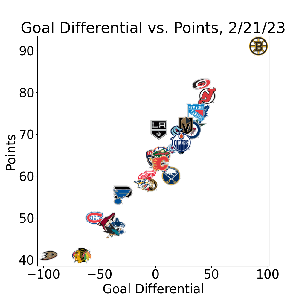 Edit: Actually I just ran through calculating this stat. The comparison with points is pretty much the same as the above, as you might expect. Comparing this stat to the goal differential though; every team is on a tight line with the exception of the ducks, who are underperforming (relative to this statistic). Plots here: https://twitter.com/Super_Fluid_/status/1628115662261587968