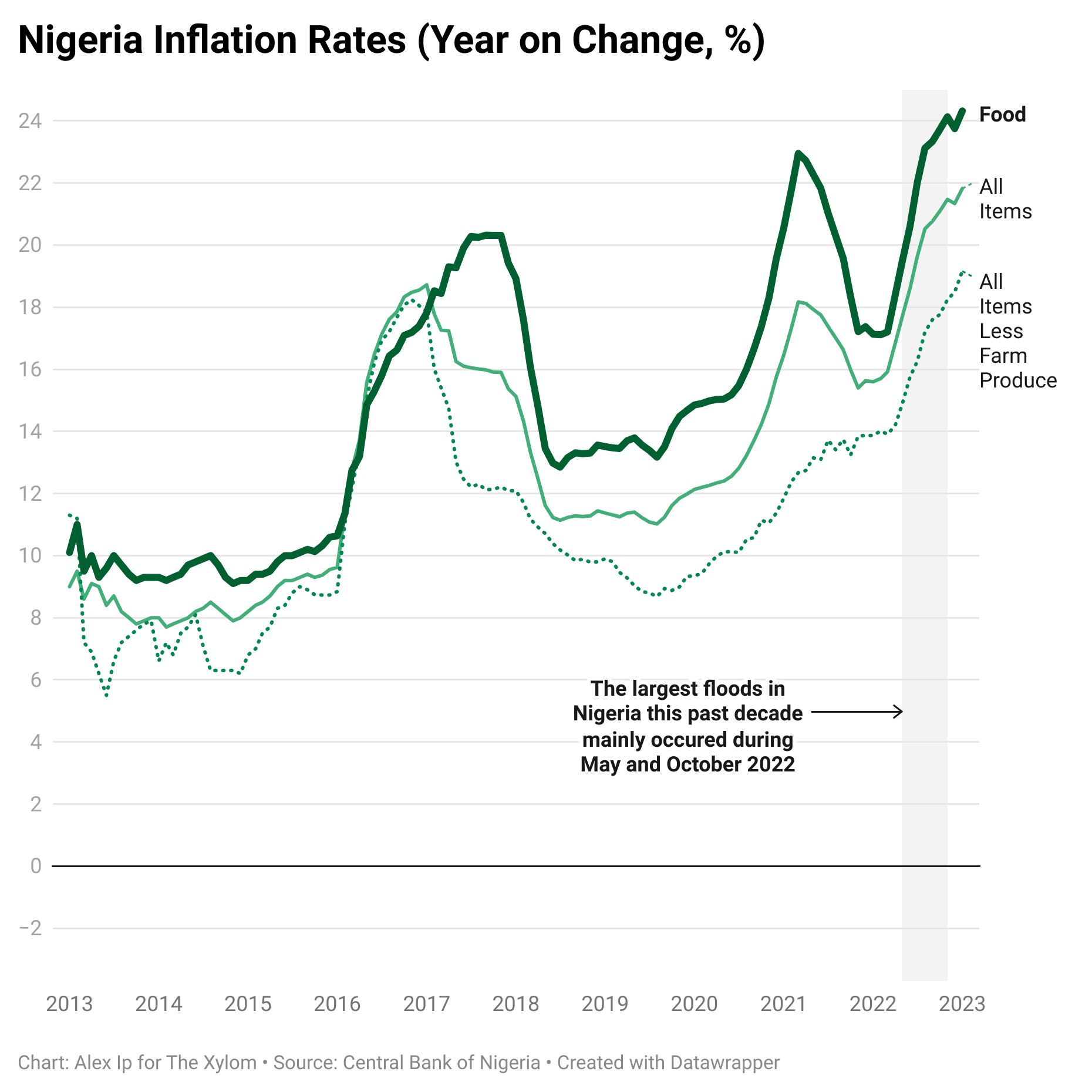 Also, if the thesis of the visualization is about the recent floods, then the time scale seems overly large, since you can pretty well capture the prior upward trend and volatility information by cutting off at 2018 or so. If however you were to include markings shading other major disasters and political turmoil, that would justify the time scale, and it would lend support to your thesis if, for example, you find other major events that don't correspond to dramatic changes in these economic indicators, and mark them as well. (You should be impartial in choosing events however. Significant events like the oil crash from 2014--2016 that sent Nigeria into a spiralling recession in 2016, should not be ignored.)