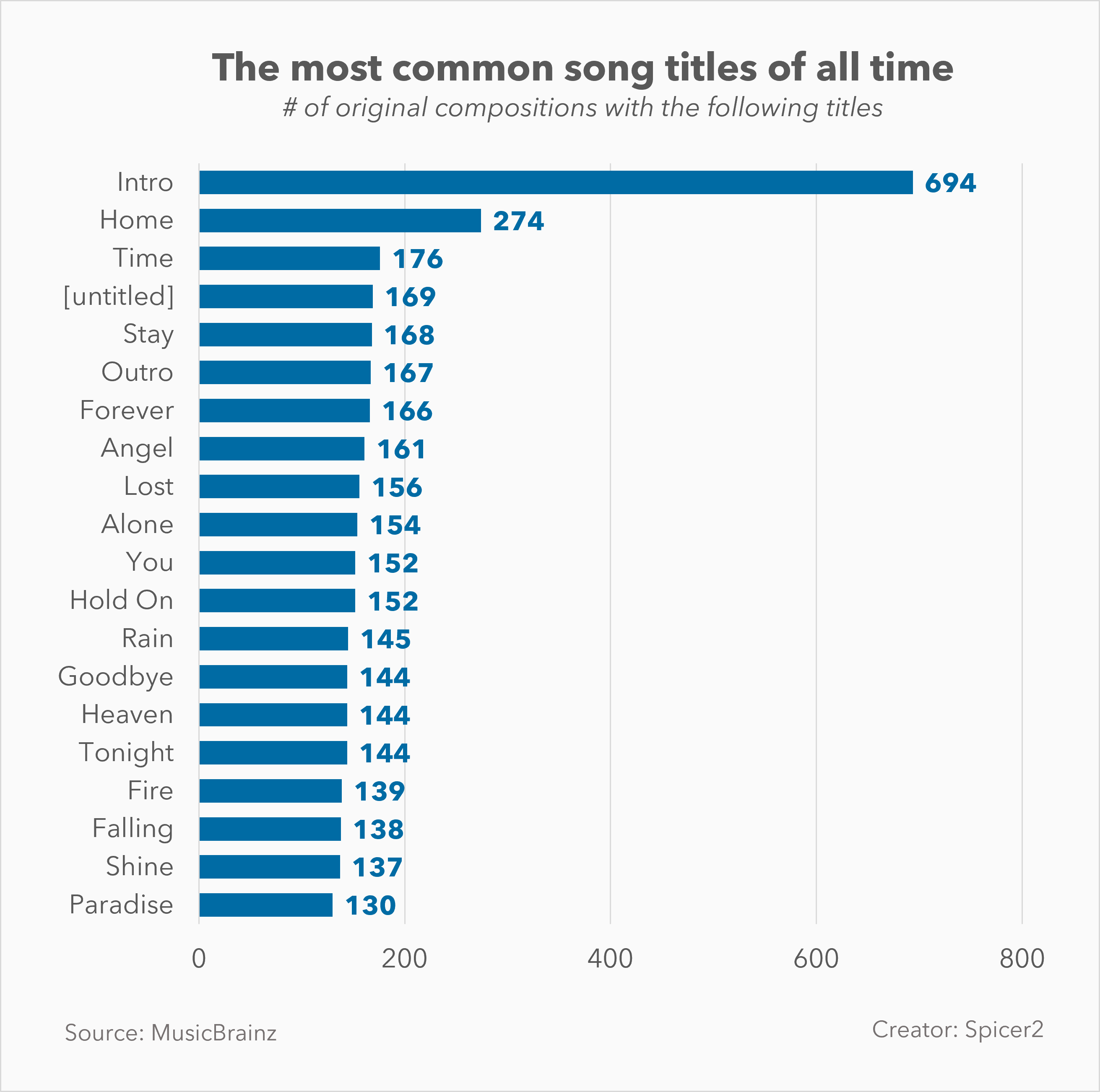 [OC] The most common song titles in music Submitted by spicer2 t3_11r437e on March 14, 2023 at 11:53 AM in dataisbeautiful 148 comments 2,171