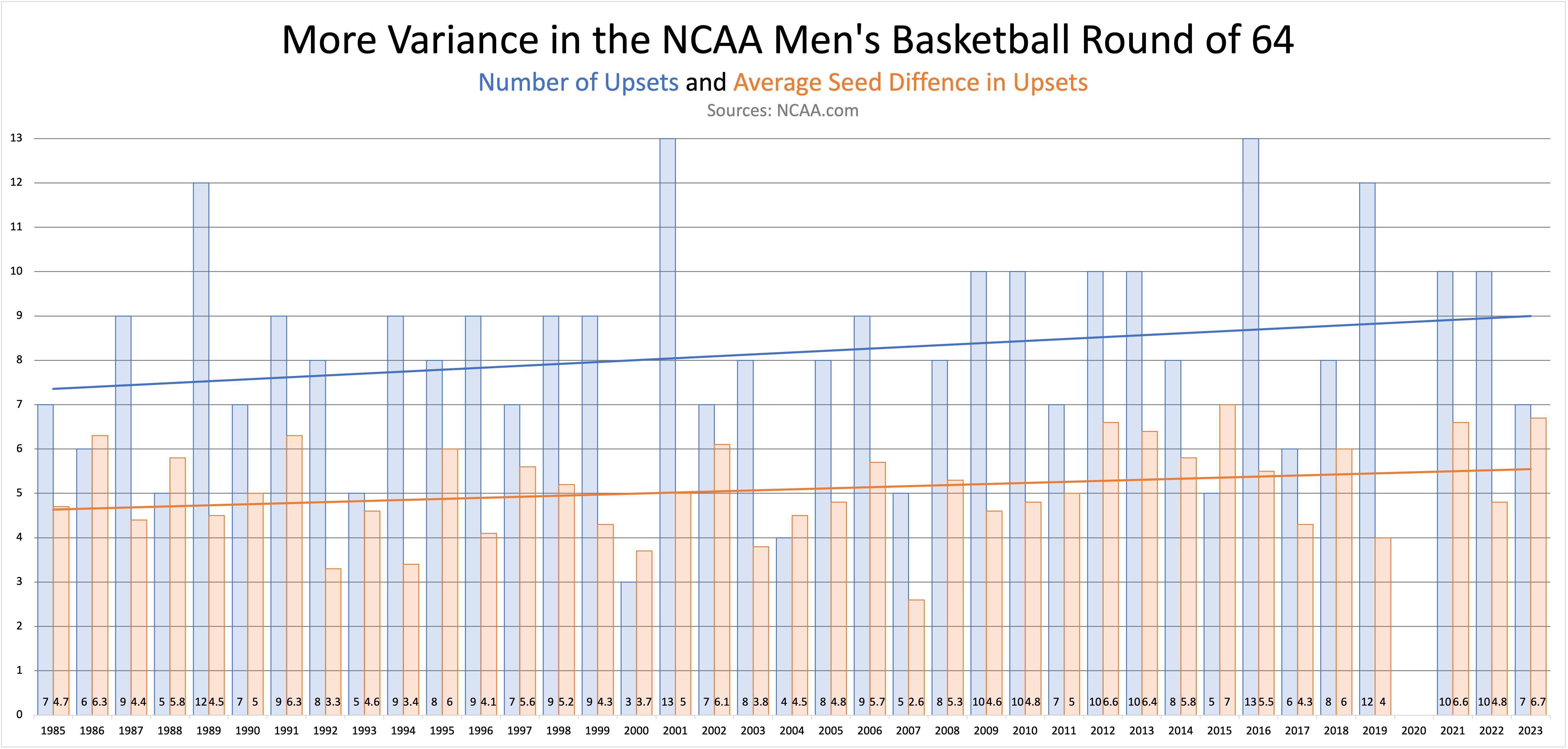 Since the Round of 64 began in 1985, both upsets and the average seed difference have been on the rise. For this visualization games between 8 and 9 seeds have been included even though the NCAA does not classify them as upsets. Had they not been included the broad trends still hold, with the average seed difference actually becoming more pronounced (6.7 average seed difference this year with 9 over 8 wins included, 9 average seed difference with those games excluded for example).