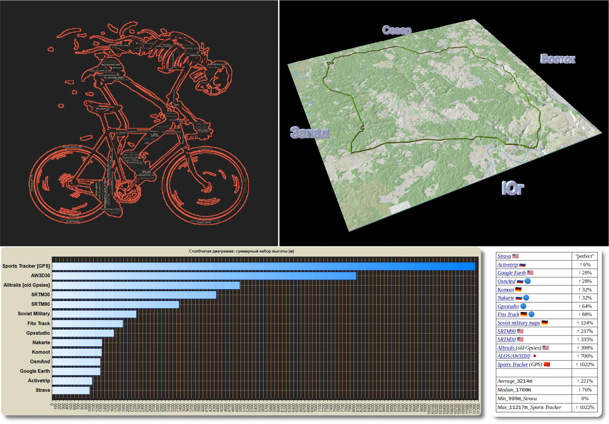 With respect to Strava, a calculation and comparison is underway (for the purity of the experience, the height in the track has been removed and each software assigns its own climb). More details on each software in the source at the link to the description of the visualization.