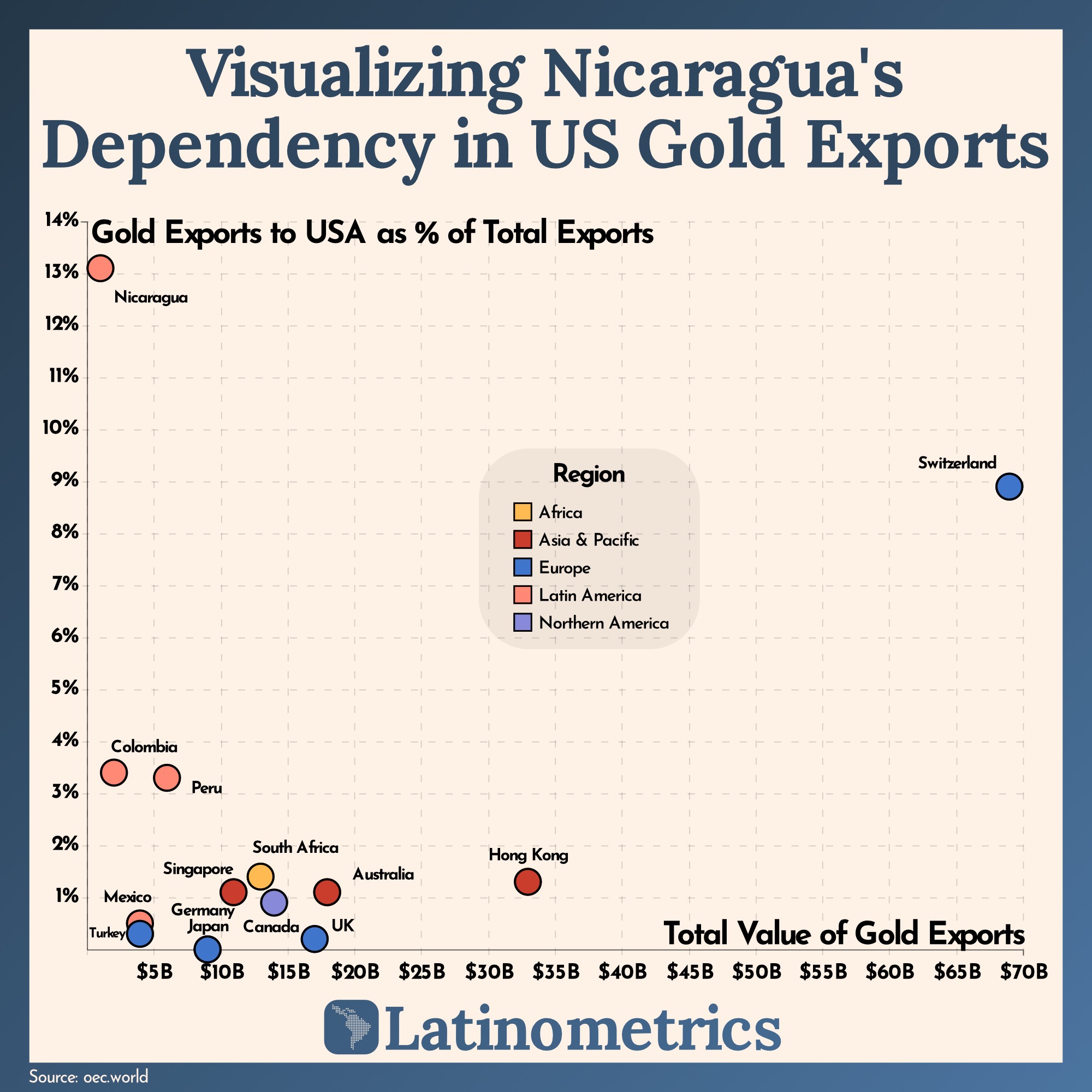 [OC] Visualizing Nicaragua's Dependency in US Gold Exports Submitted by latinometrics t3_ysnofn on November 11, 2022 at 9:26 PM in dataisbeautiful 13 comments 19