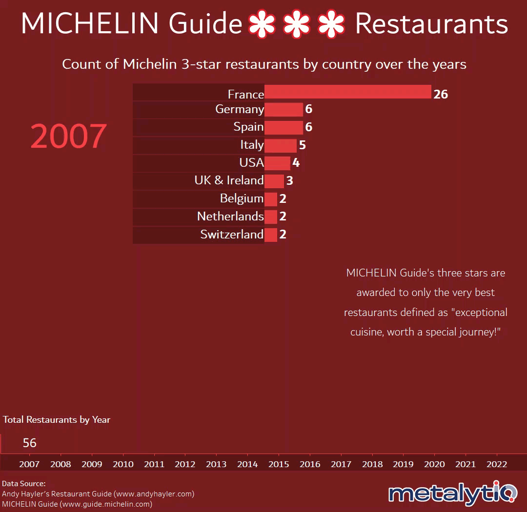 Agree that Michelin has brought down the value of the one and two star rating by awarding so many restaurants. Originally we wanted to include the one and two star restaurant counts but the data was difficult to find. We worked closely with Andy Hayler, who is a Michelin historian and he may have enough data to do a future visualization to include and one/two star restaurants.