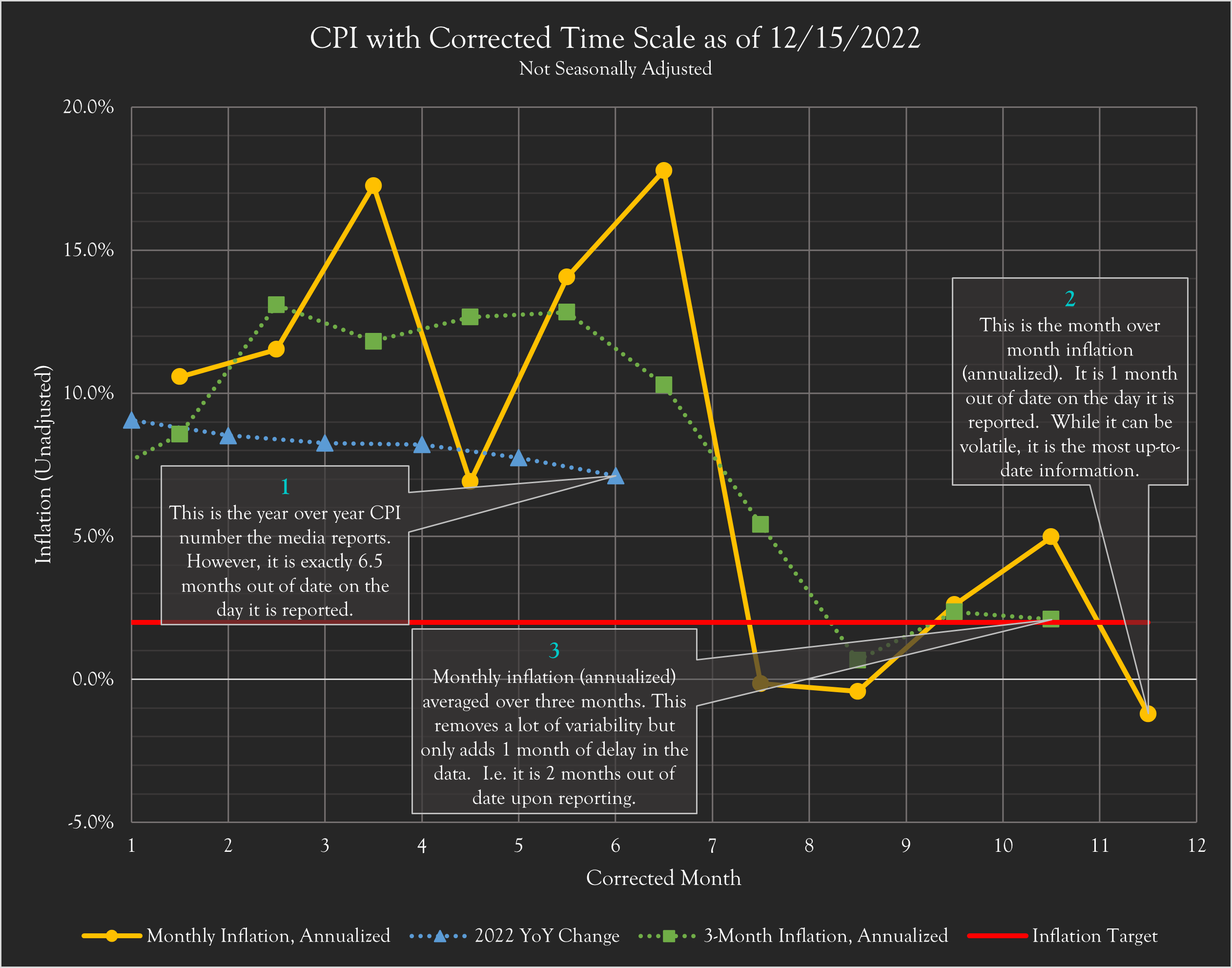 In the case of YOY, the delay is 11/2, or 5.5. Add on the 1 month of delay in the reporting and you have 6.5 months. So, the number reported on 12/15 actually represents the inflation on 6/1.