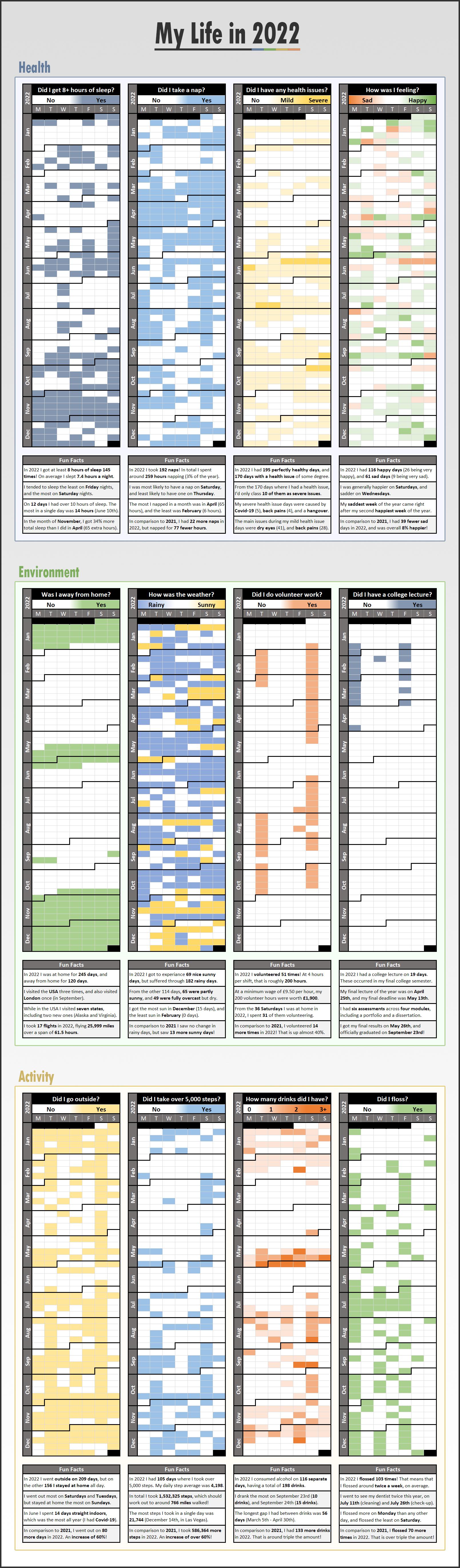 [OC] My life in 2022, tracked across 12 metrics! Submitted by TravellingTabby t3_10p4xat on January 30, 2023 at 3:02 PM in dataisbeautiful 63 comments 620