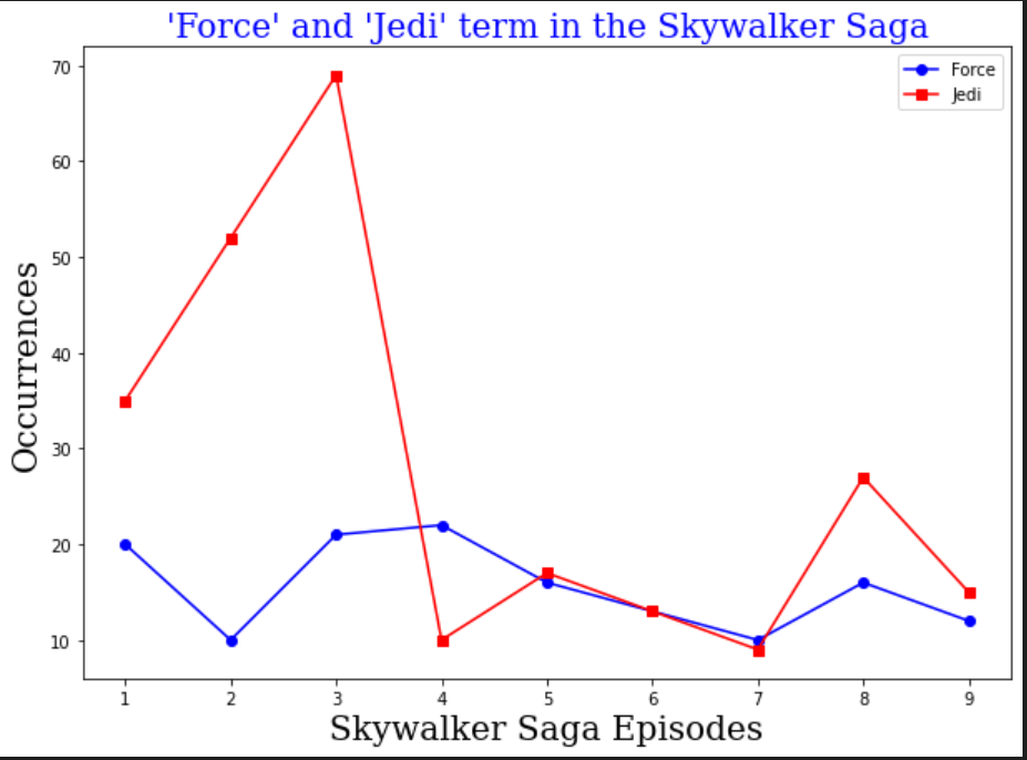 I already had subtitles for all the Star Wars films in my laptop. So I converted them into text files and parsed through each of them the words "Jedi" and "force".