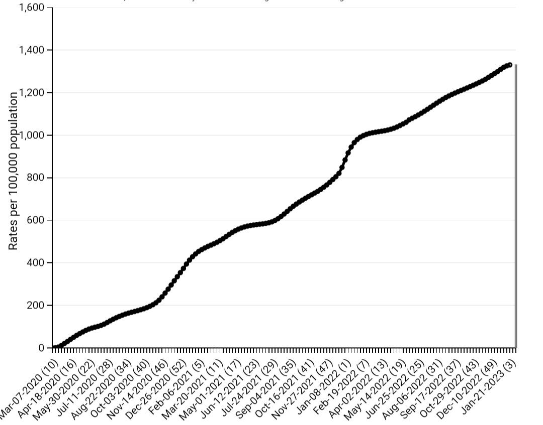 The total appears to be approximately 4.5 million hospitalizations with no signs of the hospitalizations per unit time decreasing.