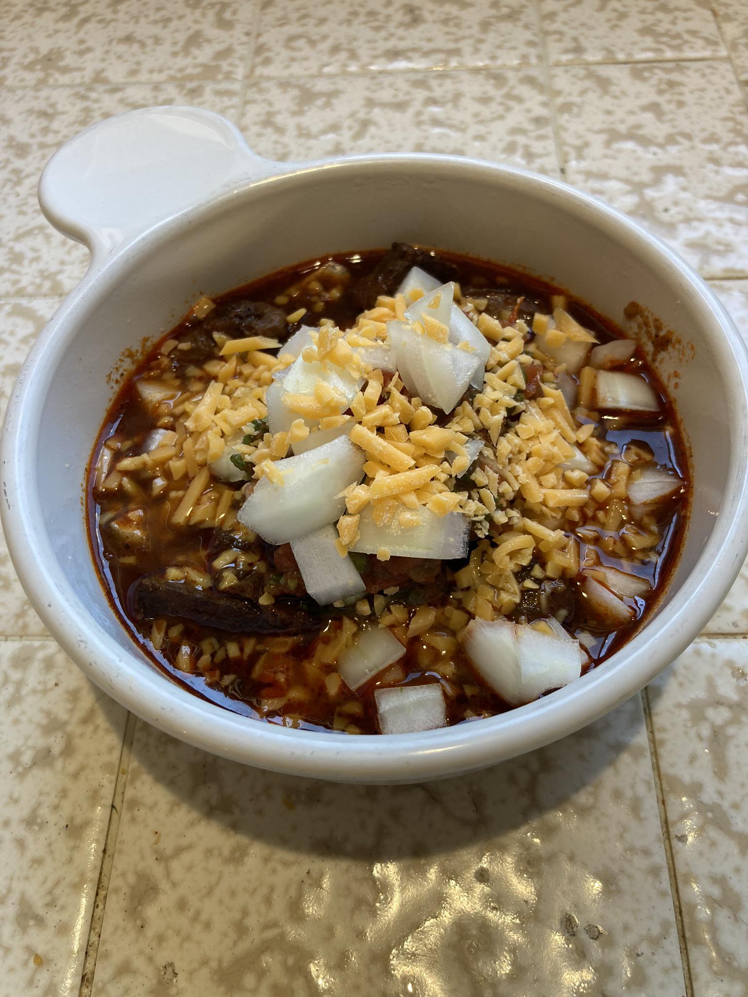 OP said "Texas Chili". That means something. It doesn't mean "big chunks of raw onion".