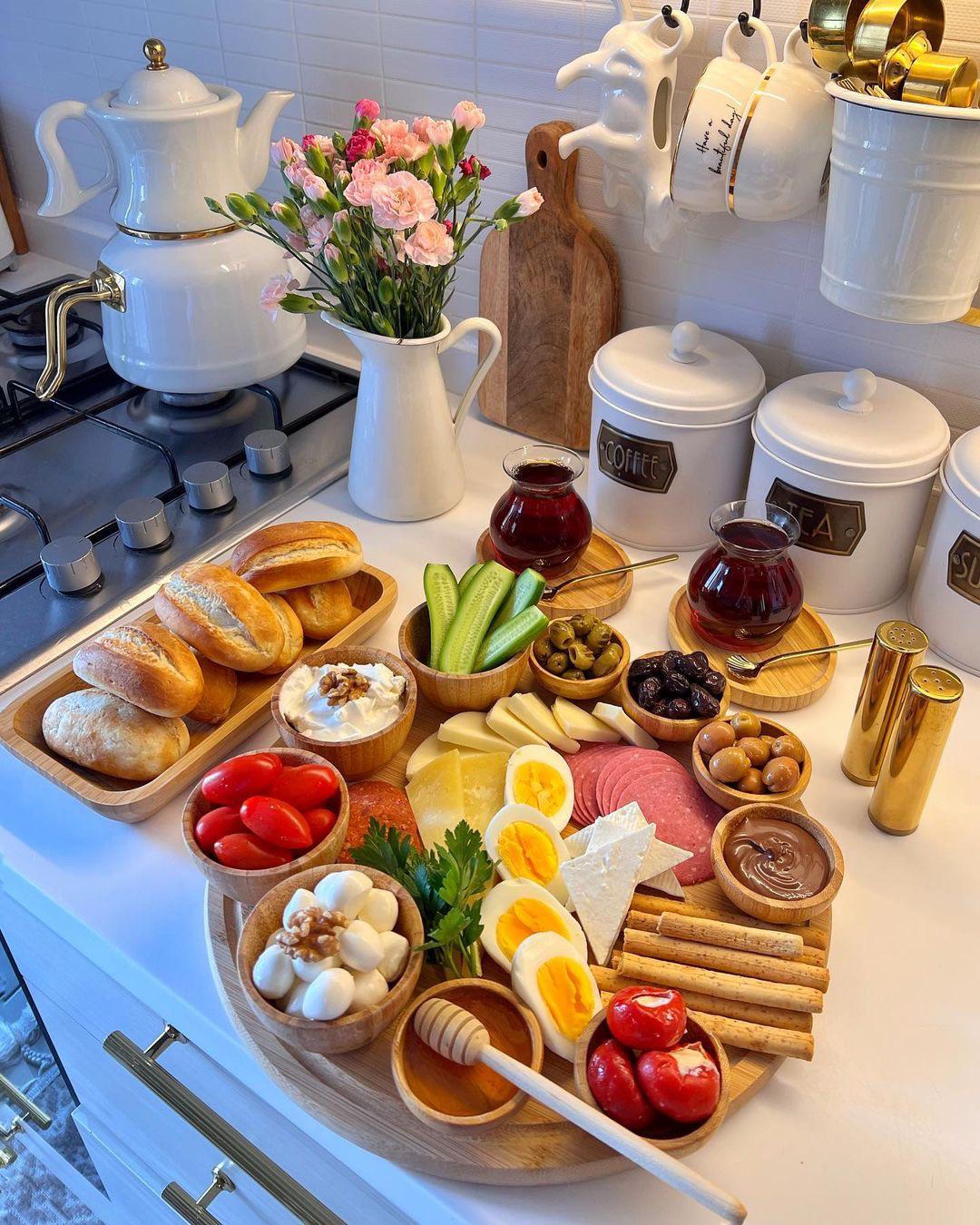 A few month ago, I was parting with friends in another city. The next morning, we wanted breakfast, but there were only these little cafés where you pay a lot for a little breakfast. Then, we saw one place that was a big restaurant and full of people. A Turkish breakfast restaurant. We had no idea how Turks eat breakfast, so we went in. It was like OPs picture, just delicious stuff and lots and lots of everything, but in small cups. One of the best breakfasts ever. Fig jam is really good with goat cheese.