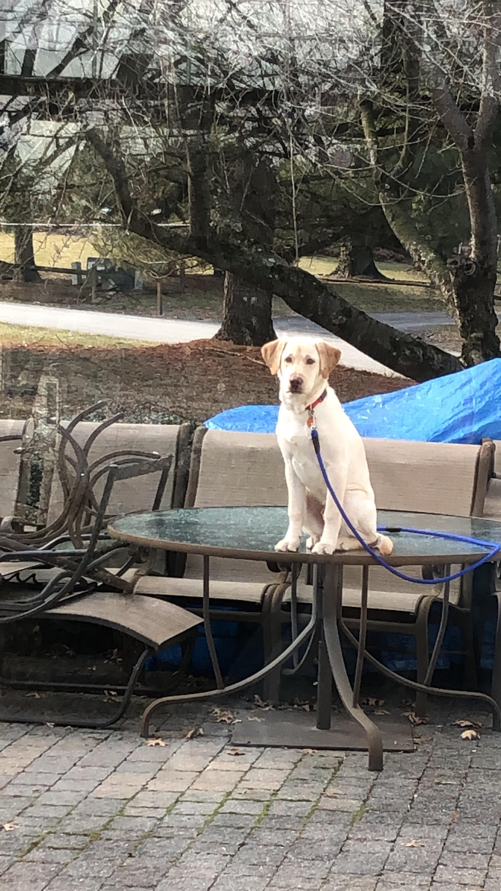 I’m trying to visualise how he got the whole length of the leash onto the table and then got it to stay on the table. The human end of the leash would be dragging on the ground and would have a tendency to remain on the ground when he jumped up.
