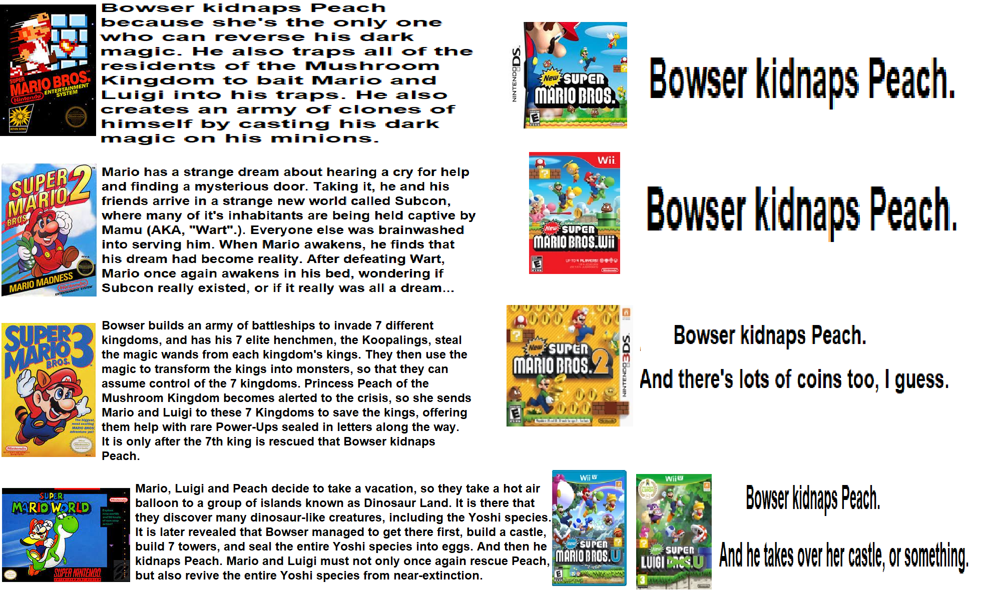 The newer games almost become philosophical in terms of story, because they're so barebones. The princess is kidnapped by bowser, because that is their nature. Peach's nature is to be kidnapped, Bowser's nature is to do the kidnapping. It's no different than the rain falling or the wind blowing.