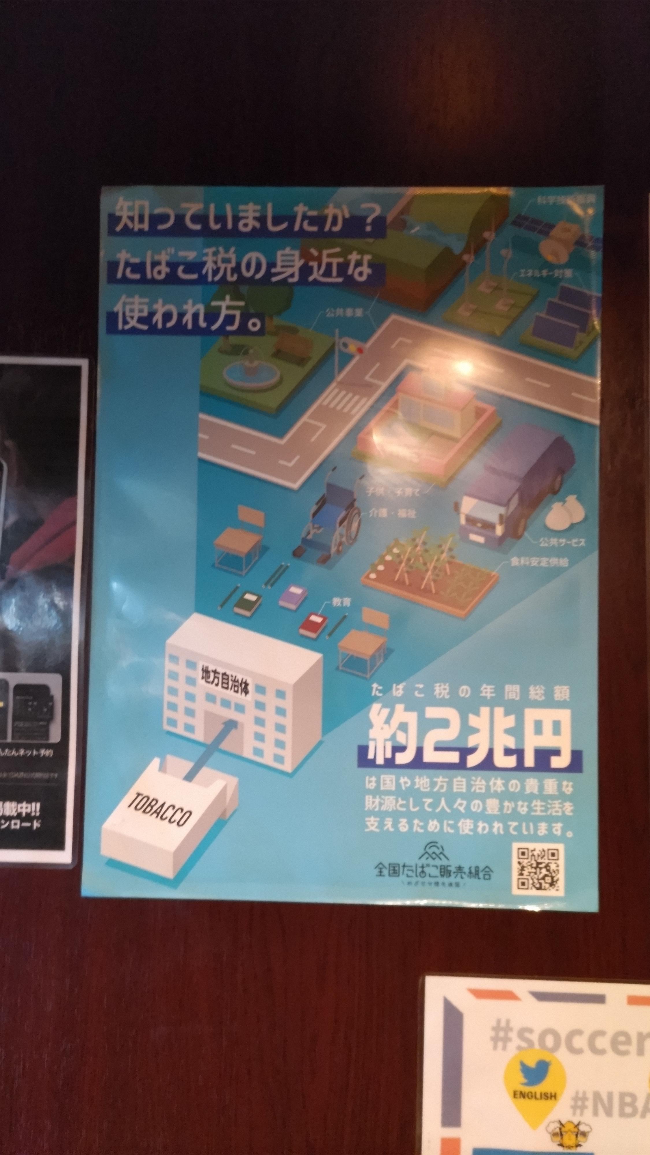 This is a photo taken in a smoking room in a Japanese bar. The top left says 'Do you know the ways tobacco taxes are used?' bottom right 'tobacco raises 2billion yen (~$20b) it is used by the government to enrich the lives of the people.' underneath that is the logo and name of the national tobacco association.
