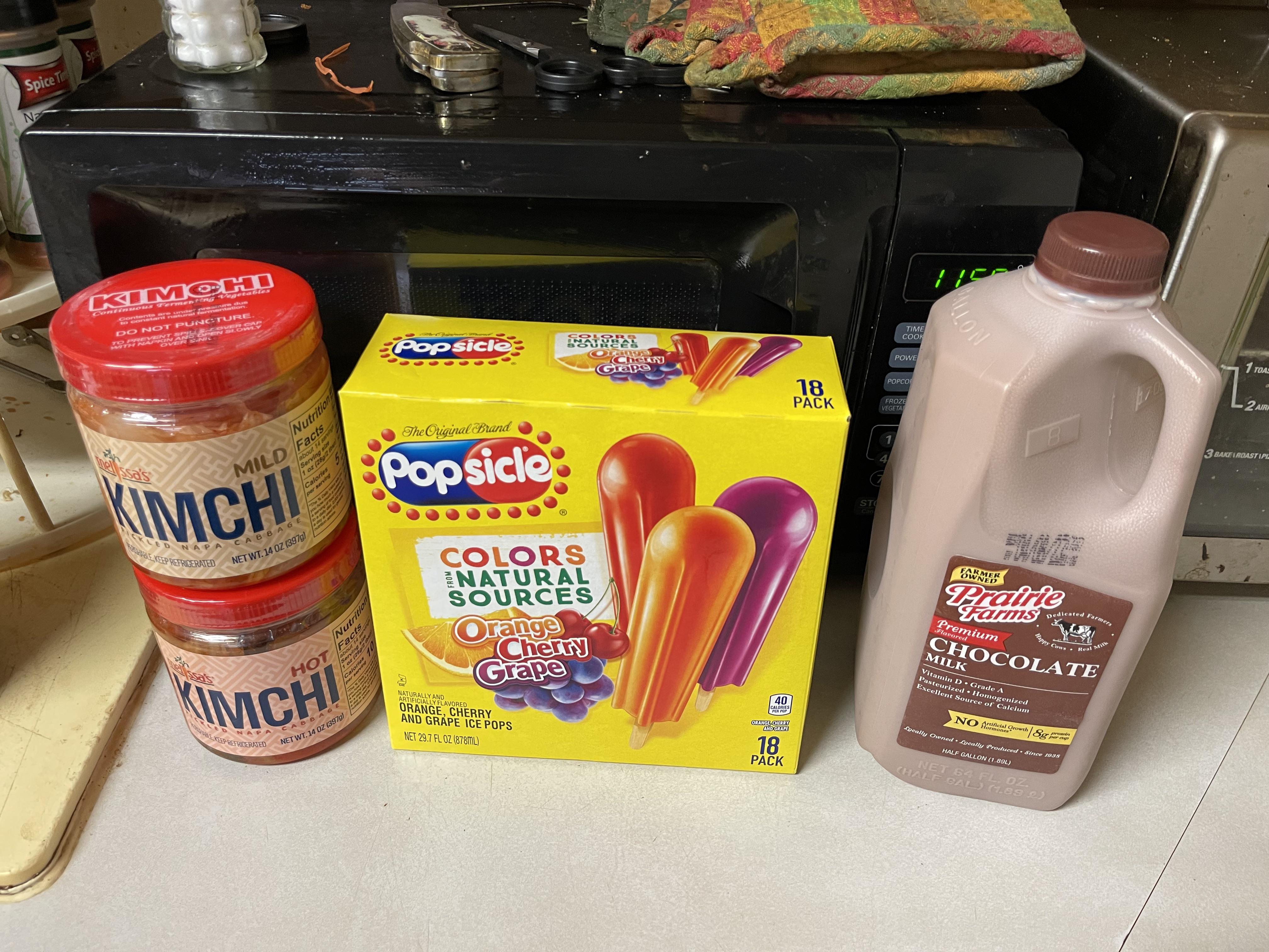Reply to comment by VulgarSlinky in [OC]The roomie's welcome home treat. He requested kimchi, popsicles, & choccy milk. by VulgarSlinky
