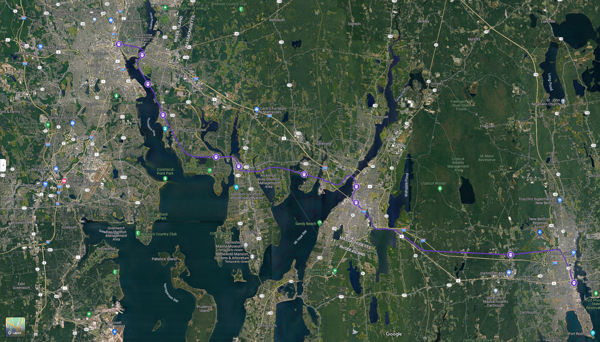 Realistically you could use the line from Attleboro to Taunton and connect into the rail lines for Fall River and New Bedford. That line would most likely need work to allow Passenger traffic, but the rail lines are still there and active.