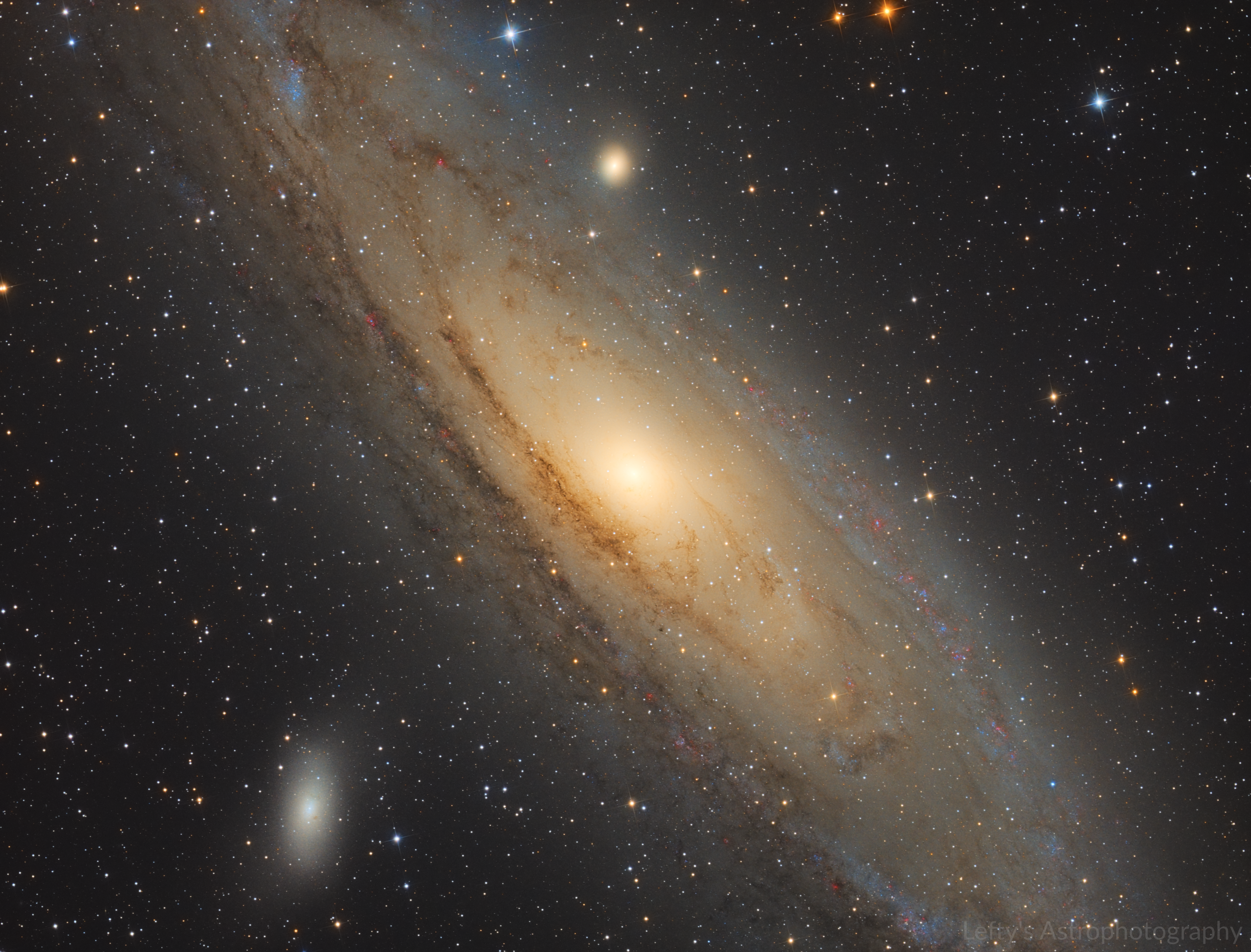 So despite doing astrophotography for over 5 years I've never gotten an image of M31 that I've completely liked until now. My last real attempt at it was in 2019, and looking back has some obvious noise reduction and color gradient issues (tbf I shot it from downtown Athens, GA). I recently visited my future in laws, who happen to live in the middle of nowhere, so I brought along my telescope to take some deep space pics. I also incorporated some hydrogen-alpha data from a while ago to help boost the Hii regions (the red splotches) in the galaxies a bit. At first I wasn't sure about the addition of the Ha data, so I ended up processing this image twice from scratch, one with Ha and one without. There were parts of each that I liked and disliked, so I blended the two finished pics together, and was very pleased with the results, which is the final image you see above. also here's a starless version for the hell of it. Captured on November 17th, 2022, from a Bortle 4 zone (Ha data was captured in October 2020 from a Bortle 6 zone)