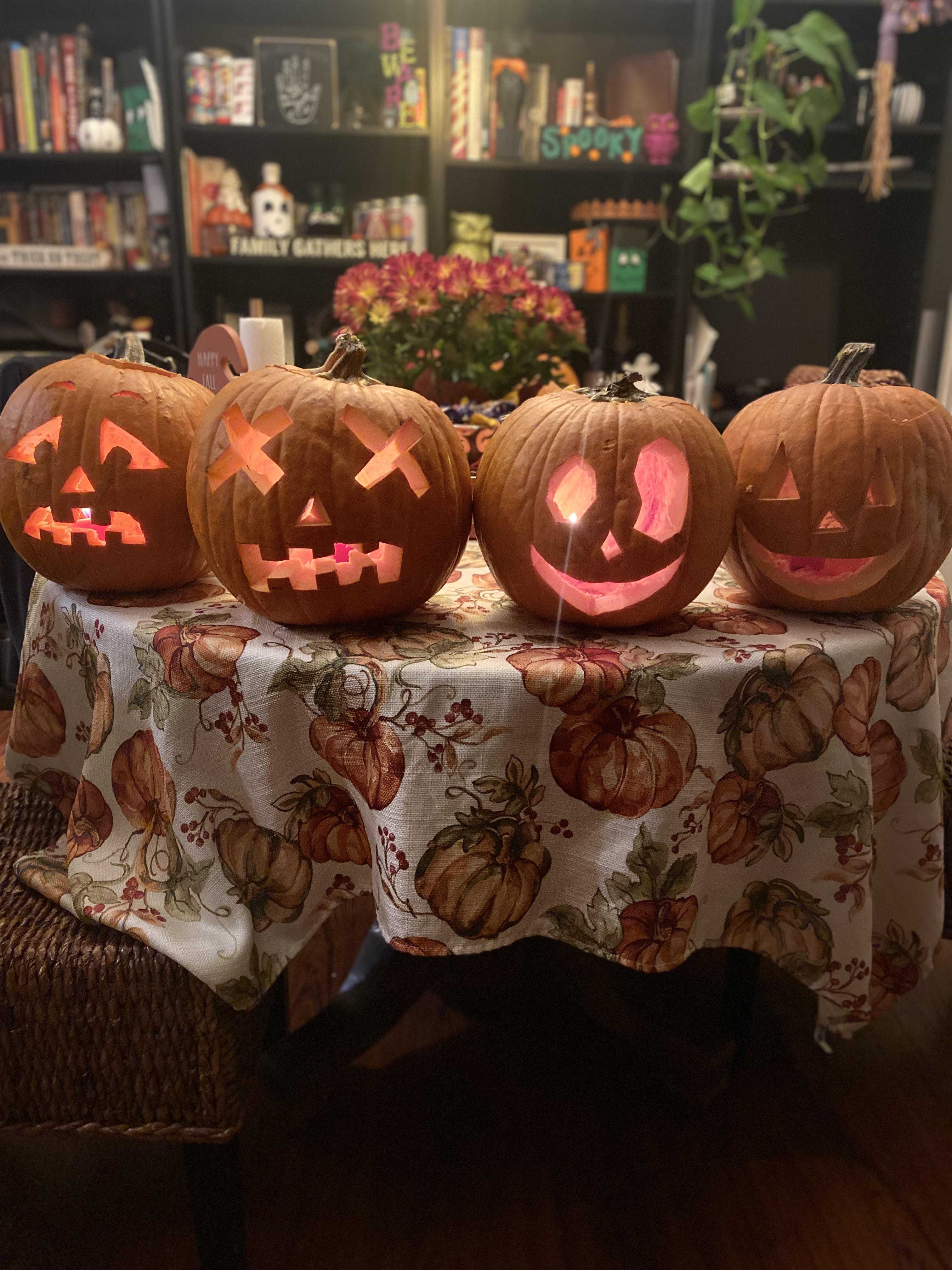 Family pumpkin carving contest!! Happy Halloween Submitted by ExpensiveStar t3_yhzo21 on October 31, 2022 at 3:36 AM in pics 10 comments 27