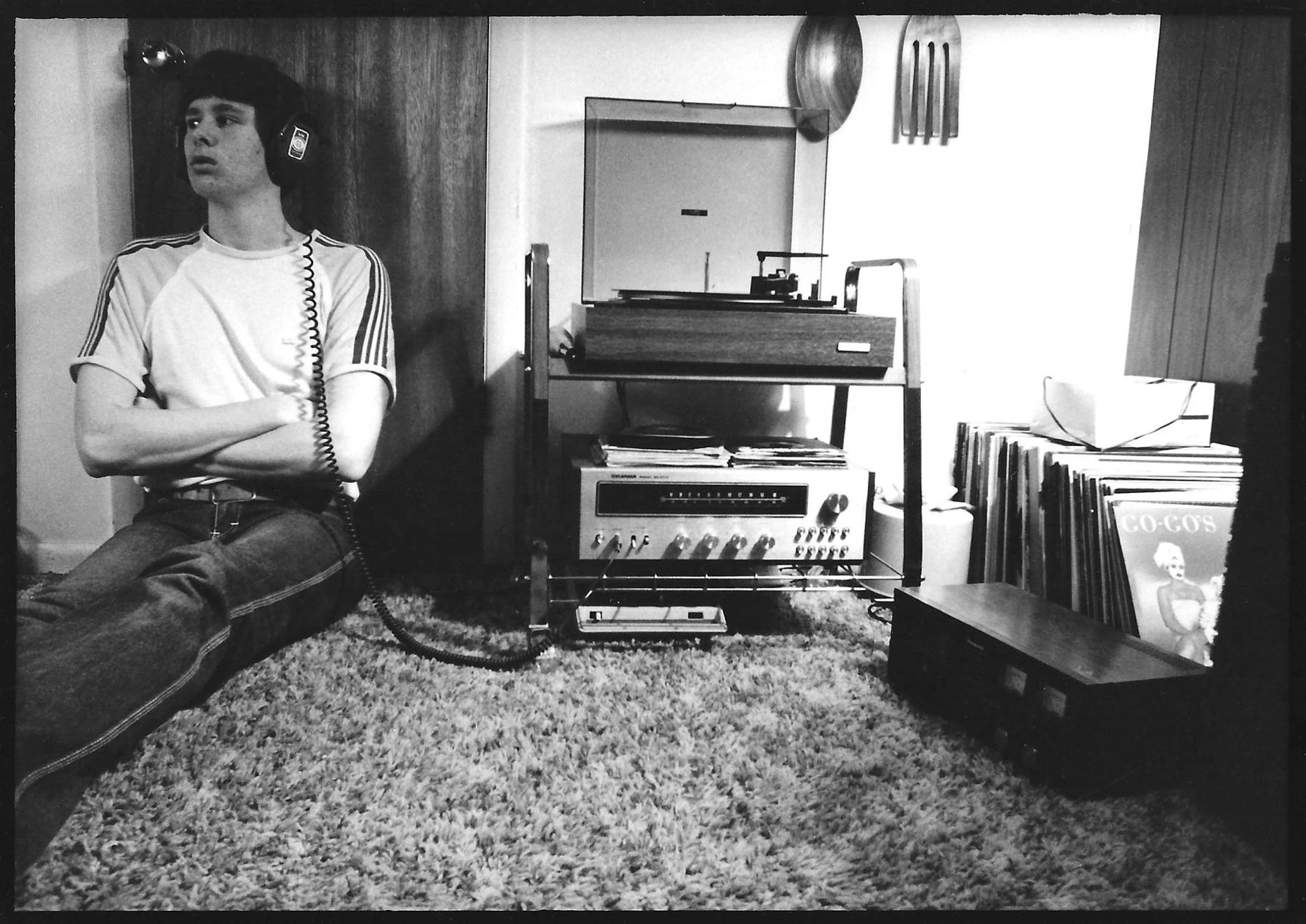 Me listening to Beauty and the Beat with Koss headphones while sitting on big ole shag carpet. The giant wooden fork and spoon is just icing on the cake.