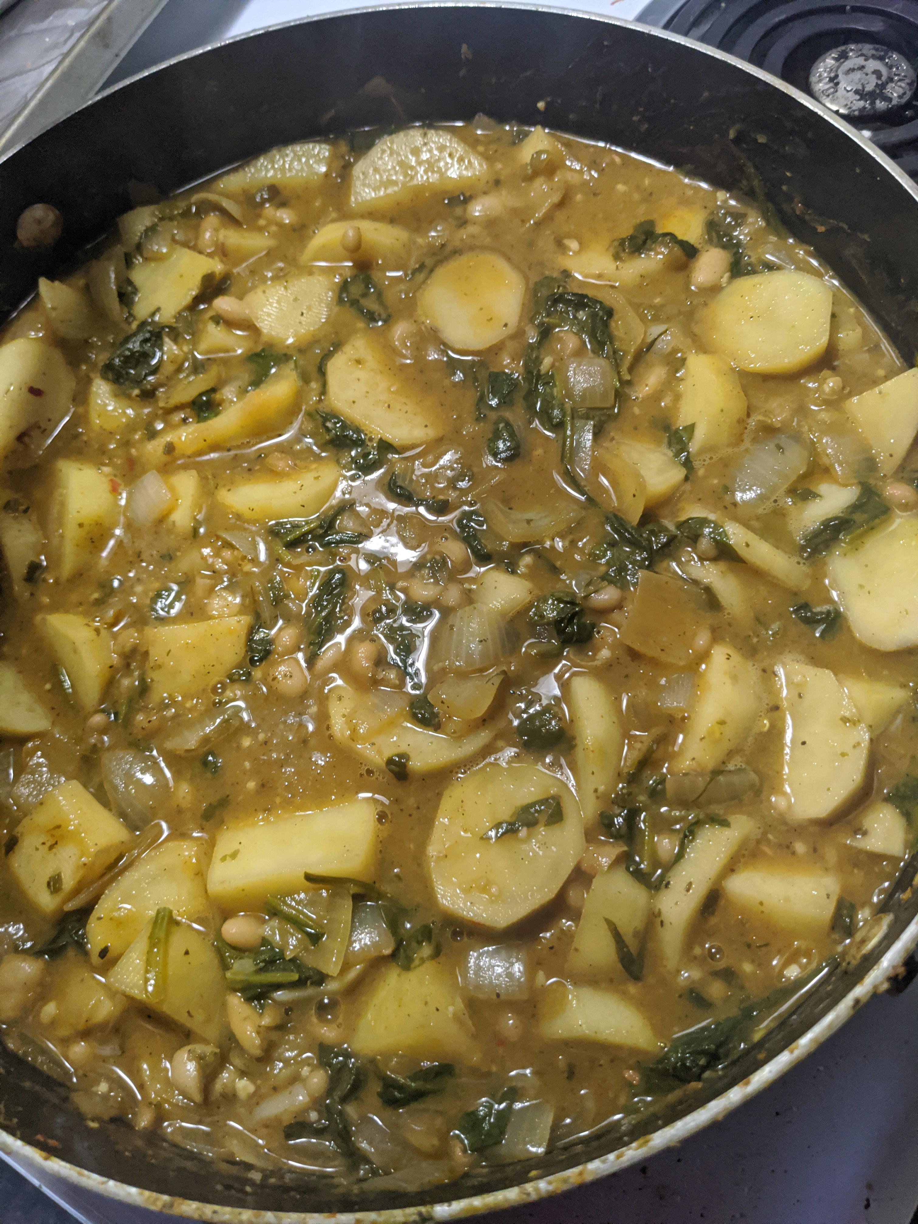 All of the stuff is sauteed together gradually, starting with onions, then beans, then potatoes then spinach. After that is when I started adding liquid, and brought it to a summer for a couple of hours. Spices were added throughout according to my own taste, and I don't really measure ingredients because I typically am winging every recipe I make. Let me know if you have any more questions! Also I remember adding a couple pats of butter.
