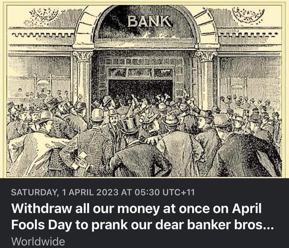 April Fools Bank Run! Submitted by Frank_Caswole t3_121sly6 on March 25, 2023 at 5:22 PM in wallstreetbets No comments 2