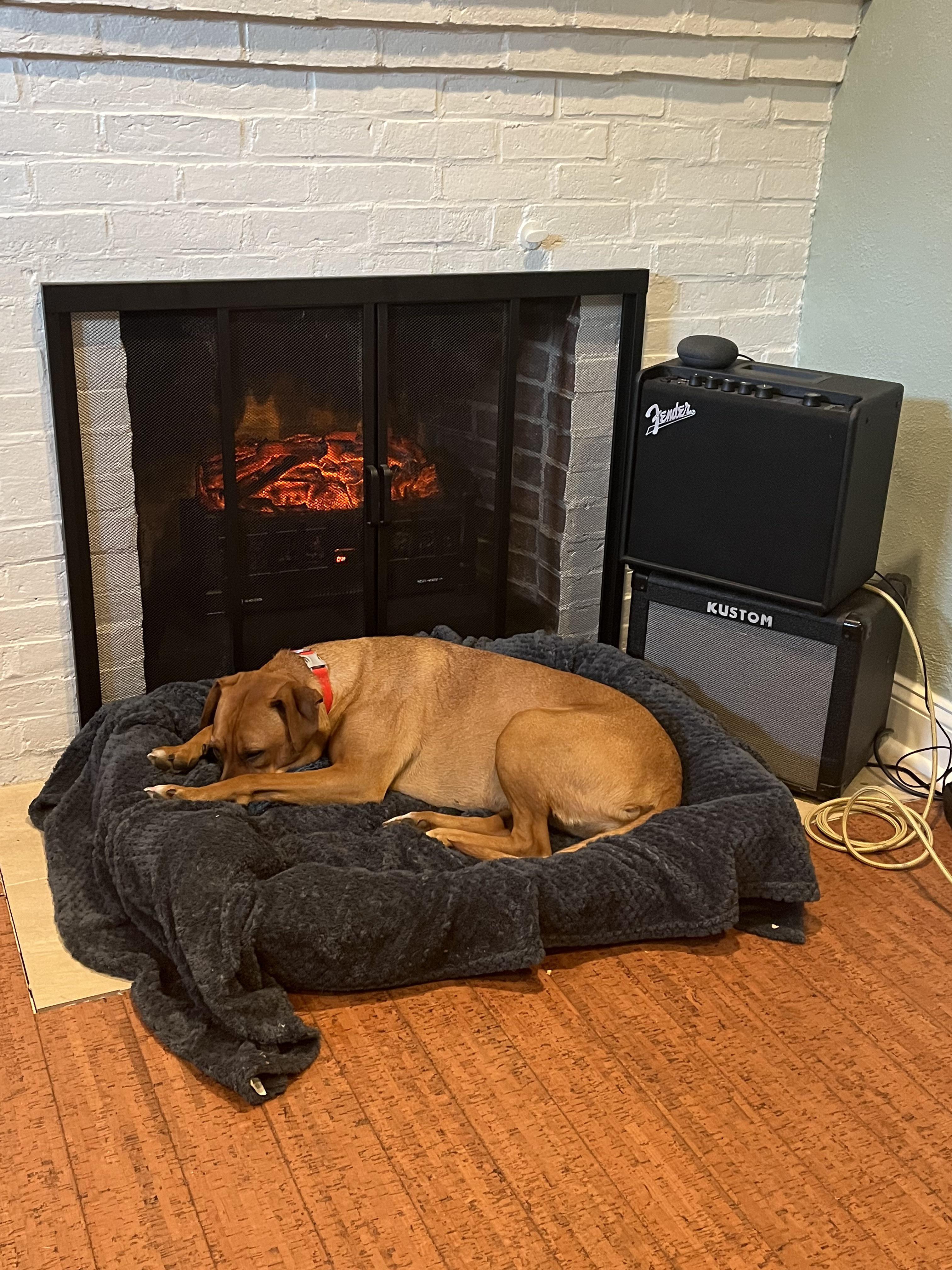 Unfortunately it’s not a real fire - this fireplace is non-functional, so I stuck an electric heater/fireplace into the gap until I get it fixed.